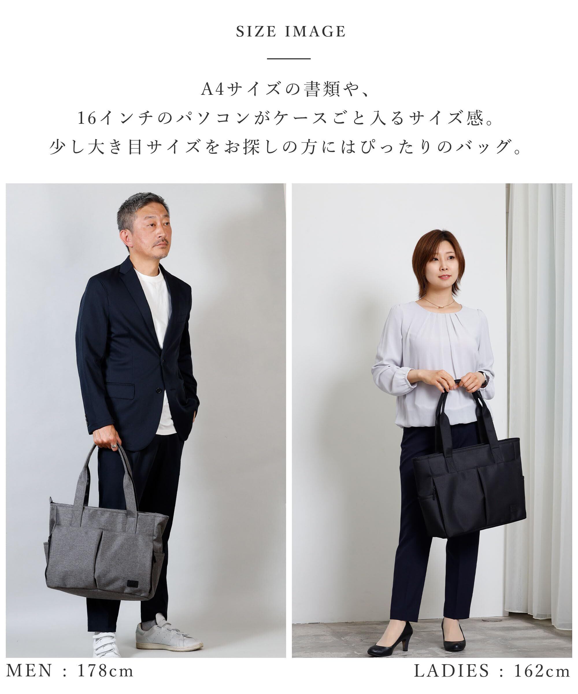 A4 サイズの書類や、16インチの パソコン がケースごと入るサイズ感。男性 にはちょうどいい、女性 には少し大き目のバッグ。 シンプルなデザインだから、 メンズ レディース 問わず 男女兼用 でお使いいただけます。通勤 や通学 、塾バッグ などのオンシーンにはもちろんのこと、休日のお出かけや公園遊び、 ジムバッグ や ゴルフバッグなどのスポーツシーンなど、シーンを選ばないシンプルなデザインも魅力。