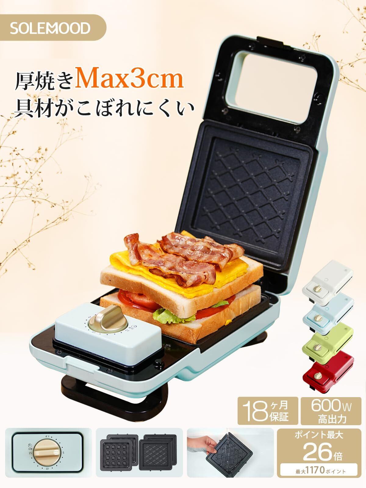 ホットサンドメーカー SOLEMOOD ワッフルメーカー 耳まで焼ける ホットサンドメーカー 電気 ワッフルメーカー 電気 圧着式 上下両面焼き ホットサンドメーカー大きめ 耳まで焼ける 4つのプレートが付属 わっふるめーかー 焼きグリルとして 朝食とランチ用に 家庭主婦/一人暮らしの方 簡単にお手入れ (グリーン)