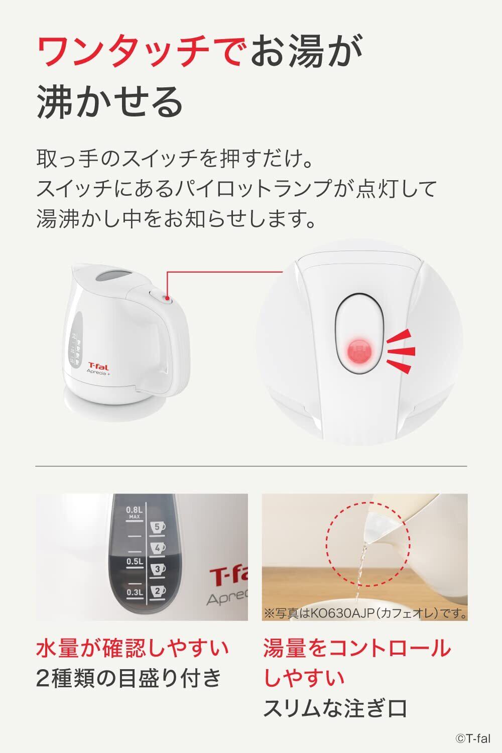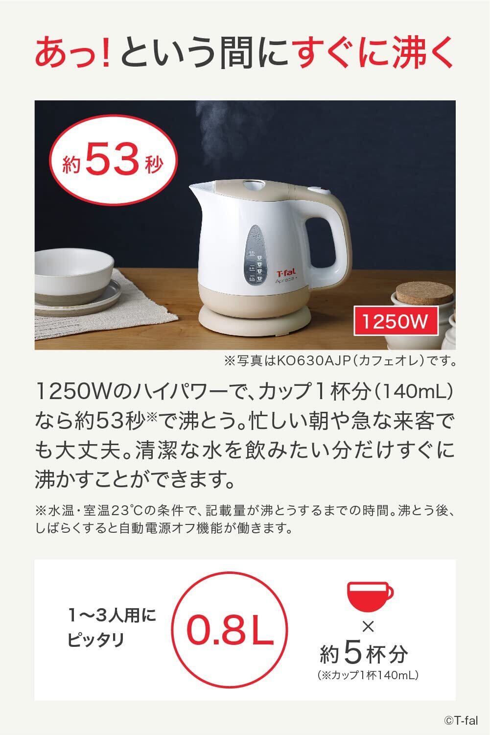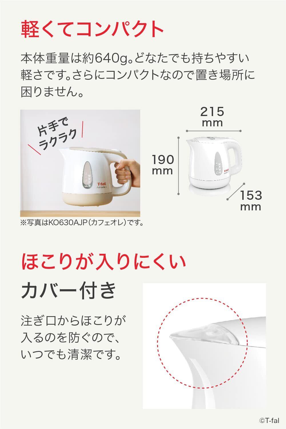 ティファール 電気ケトル 0.8L 軽くてコンパクト 「アプレシア・プラス ホワイト」 KO6301JP
