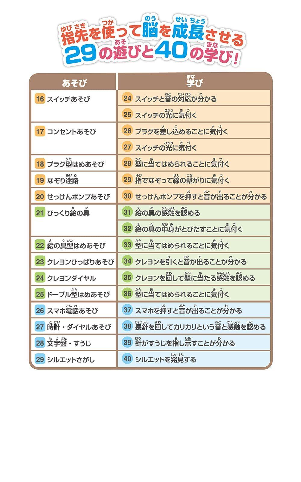 遊びのしかけが29種類、学びが40種類と豊富に盛り込まれてあり、指先を使って遊んでいるうちに脳を成長させ、 感性が豊かになっていきます。