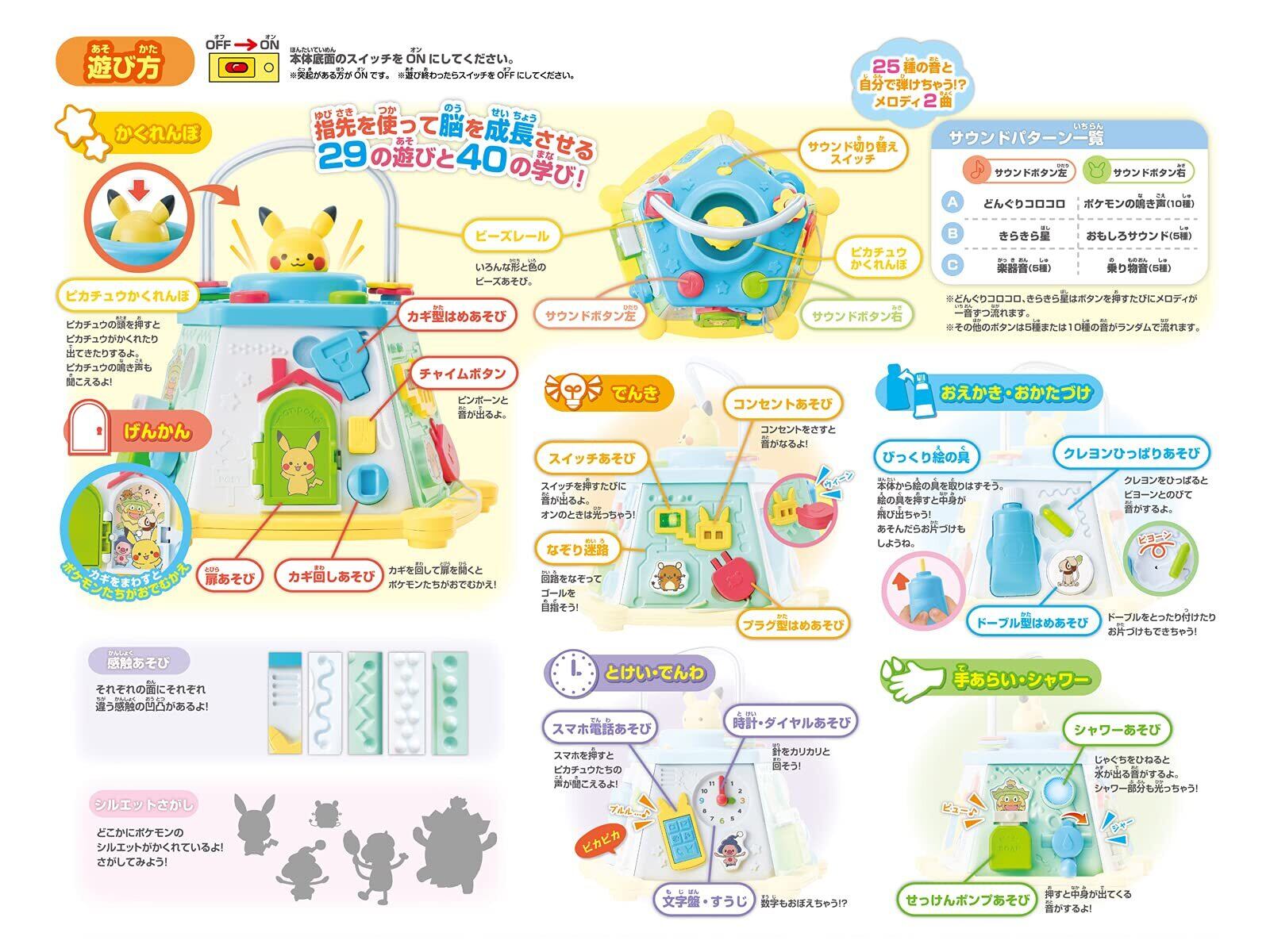 ・スイッチ類:押すと音が鳴ったり、光ったりします。ピカチュウ達の鳴き声、乗り物の音、楽器音、おもしろサウンド等が鳴ります。 連続して押すと曲になるスイッチがあり、自分で曲を弾いてる気分になれます。(どんぐりコロコロ、きらきら星)