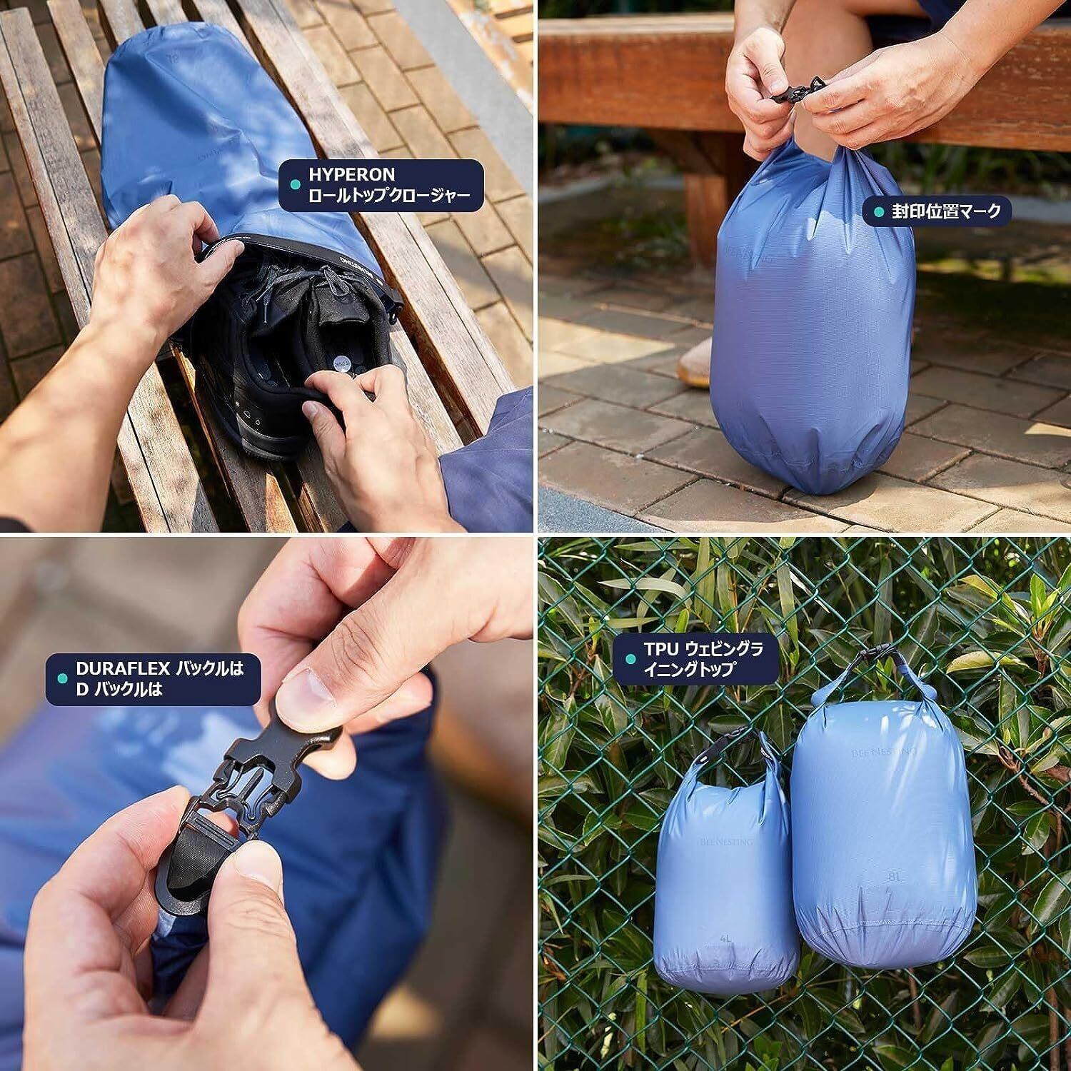 便利なギア - 2L/4L/8Lサイズ、2Lは軽食、旅行の必需品、手袋、帽子などに適しています;4Lはシェルジャケット、手袋、ビーニーなどに適しています;8Lドライバッグは、ダウン製寝袋、または替えの衣類の収納に適しています。