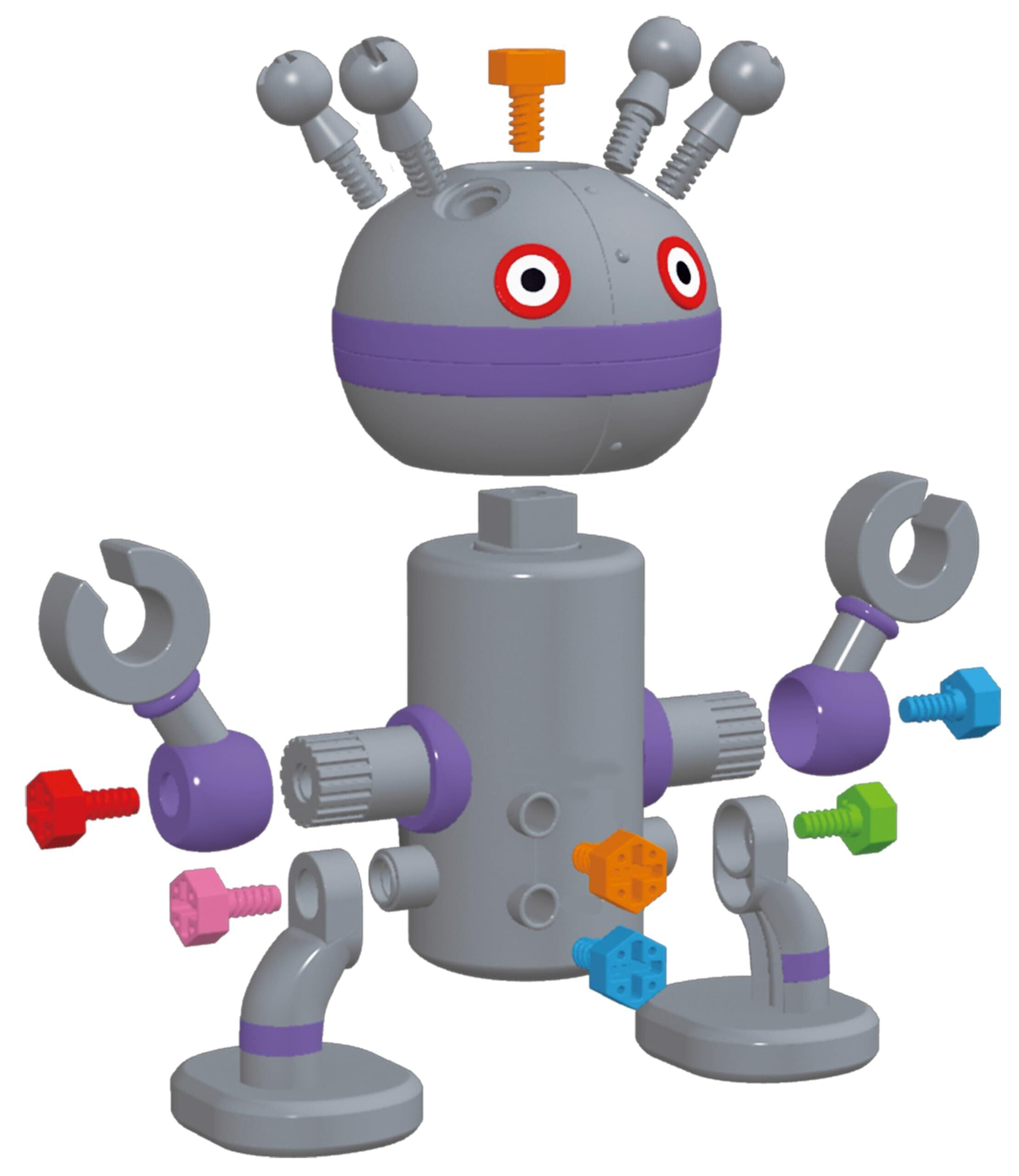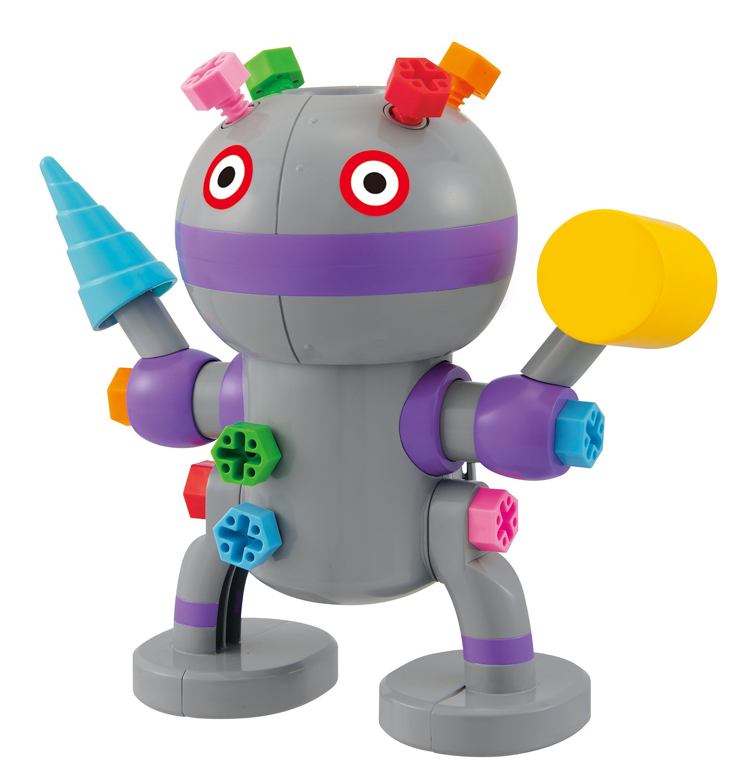 完成しただだんだんは、電動ドライバーを本体に入れて、動かすと、頭とアームが回るよ! 頭と指先を使って、組み立て遊びを楽しみながら、想像力や集中力、問題解決力を育みます。