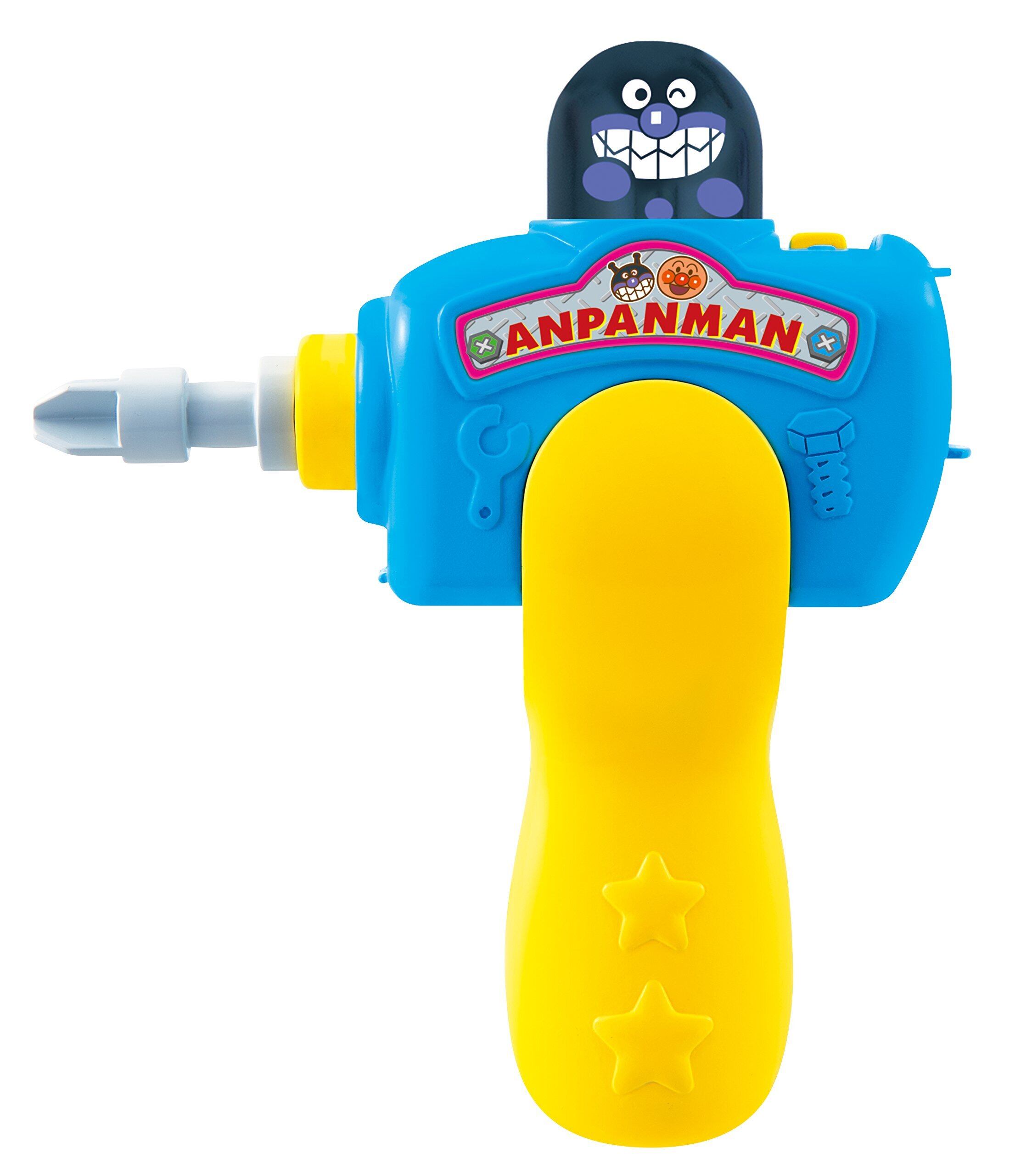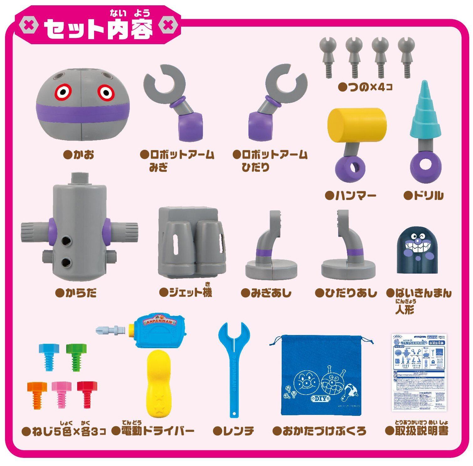 【内容物】だだんだん本体(10パーツ)、カスタマイズ部品3パーツ(ドリル、ハンマー、ジェット機)、ばいきんまん人形、電動ドライバー(本体、グリップ、ビット)、レンチ、ネジ×15、おかたづけ袋、取扱説明書