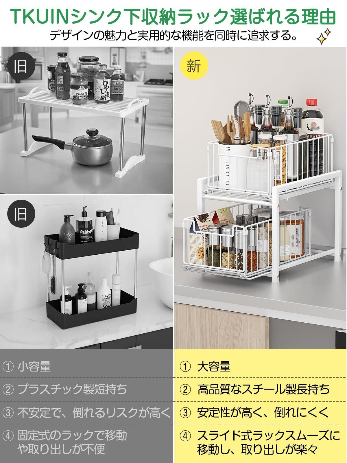 【シンク下収納をすっきり整理】シンク下はスペースがあるのに、ただ、ものが多くてごちゃごちゃしてしまったり、デッドスペースがあったりすることも多いですよね。それで、TKUINシンク下収納スライドが登場!シンク下収納をもっと使いやすくしましょう!