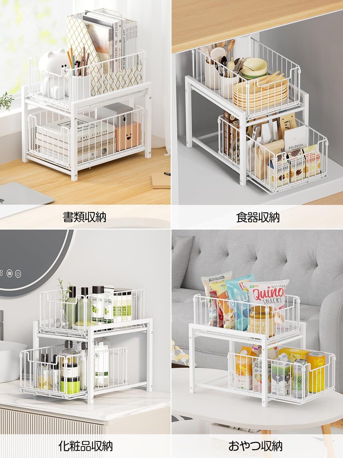 【シンク下 収納 スライド商品仕様】サイズ全体:幅27×奥行37×高さ38.5cm 引き出し×2(内寸):幅20cm×奥行33.3cm×高さ15m 上段から下段:17.5cm/材質:フレーム・引き出し・パイプ :炭素鋼/重量:約2.2kg/2色展開:ホワイト/ブラック/耐荷重:引き出し一個約15Kg 総耐荷重30Kg