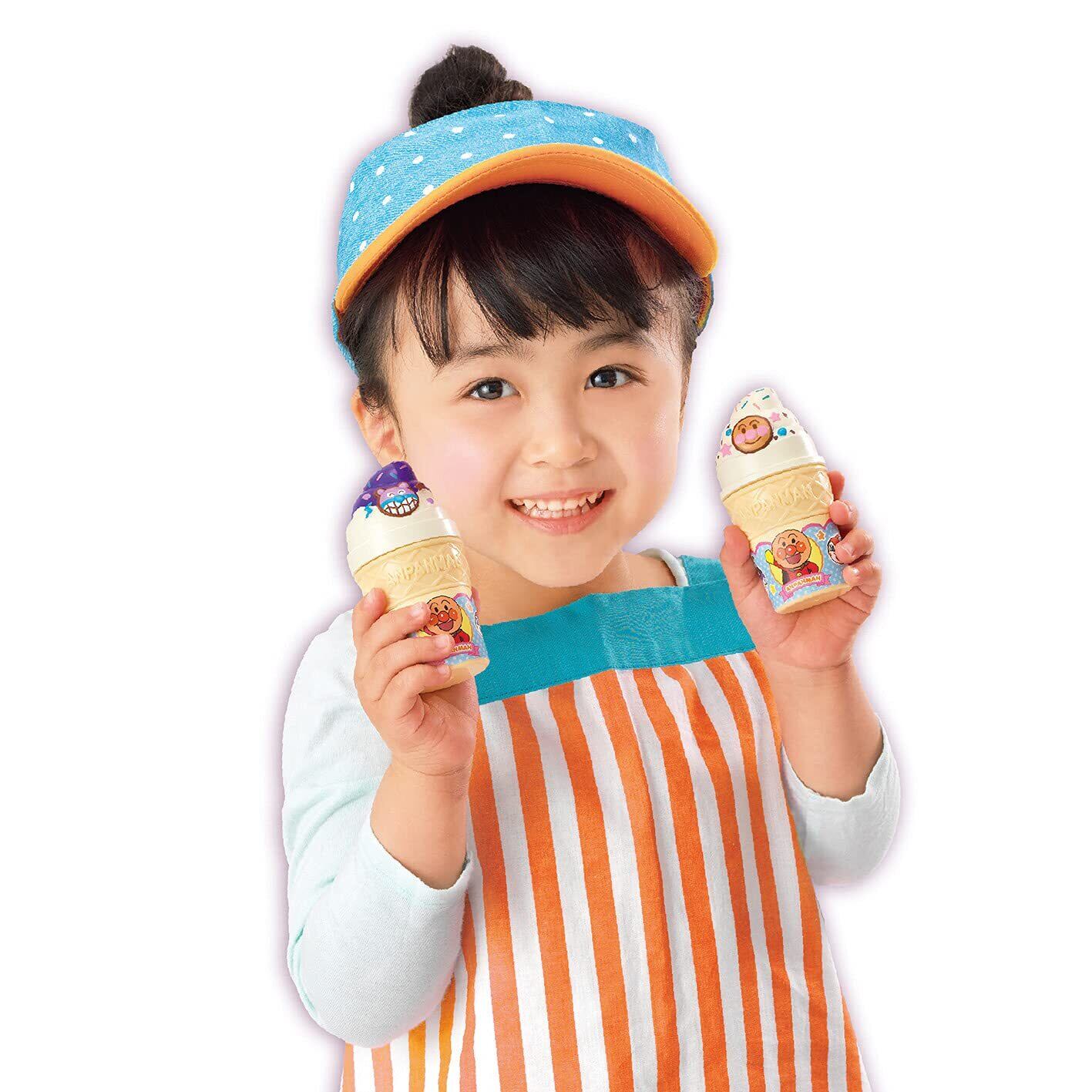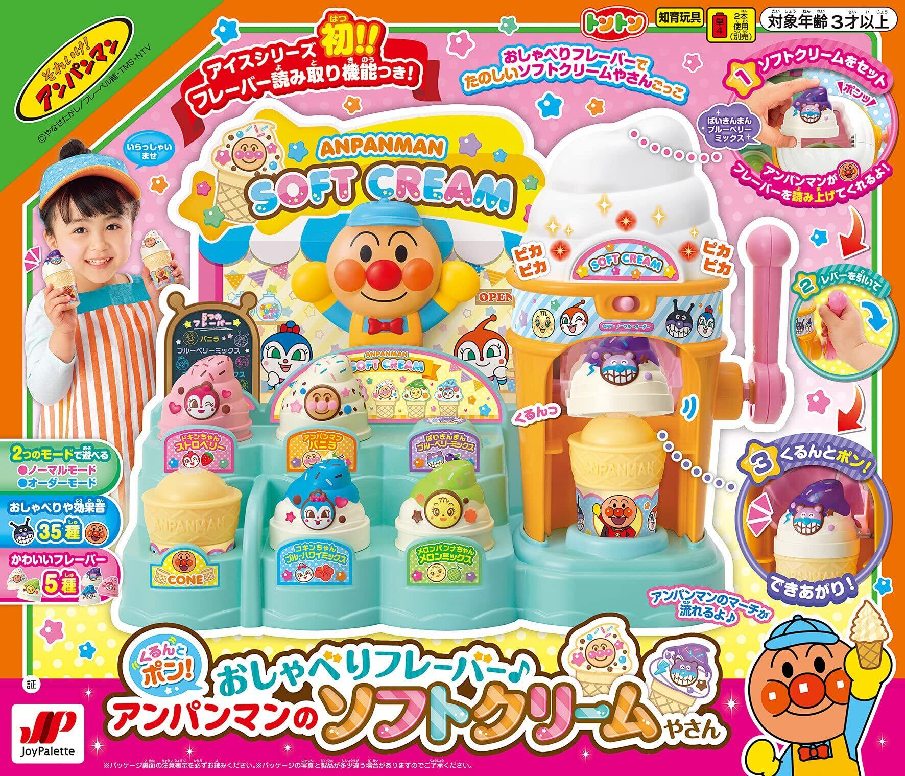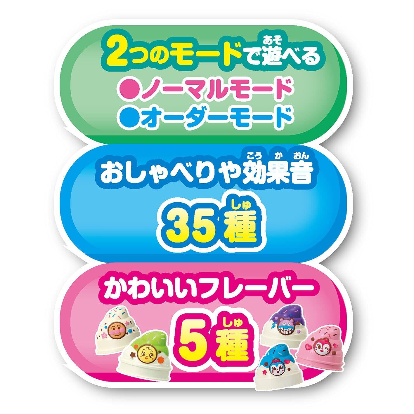 フレーバー読み取り機能が付いたソフトクリームやさんアンパンマンがフレーバーを読み上げてくれるソフトクリームやさんです。ソフトクリームをセットすると、アンパンマンがセットしたフレーバー名を読み上げてくれます。セットし、レバーを引くと、くるんとポン! と可愛いソフトクリームが完成です。