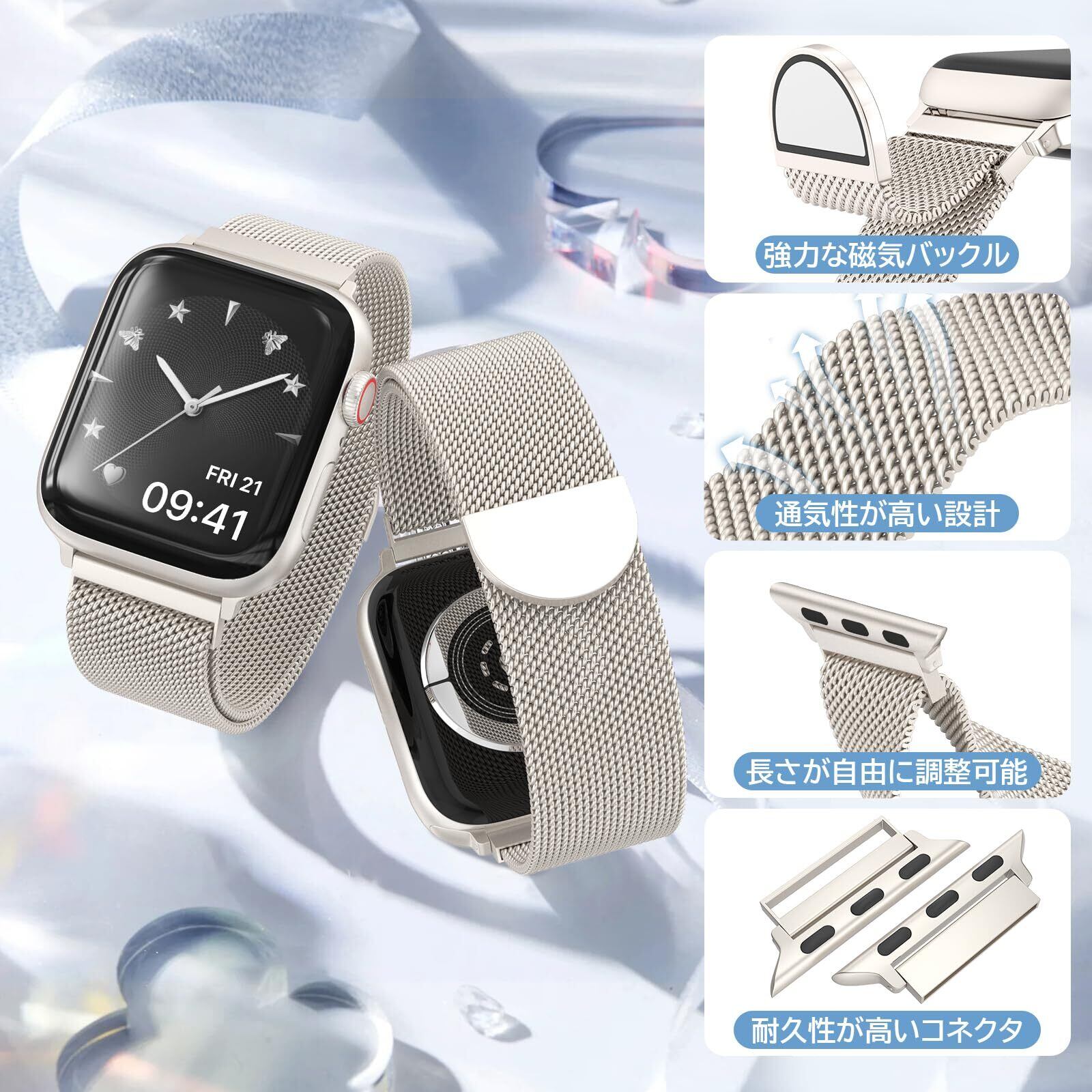 [OULUOQI] コンパチブル アップルウォッチバンド 38mm 40mm 41mm 42mm 44mm 45mm 46mm 49mm コンパチブル Apple Watch バンド ステンレス マグネット ベルト 通気 長さ調節 男女兼用 メッシュ スポーツ Watch Series Ultra/SE/10/9/8/7/6/5/4/3/2/1 に対応