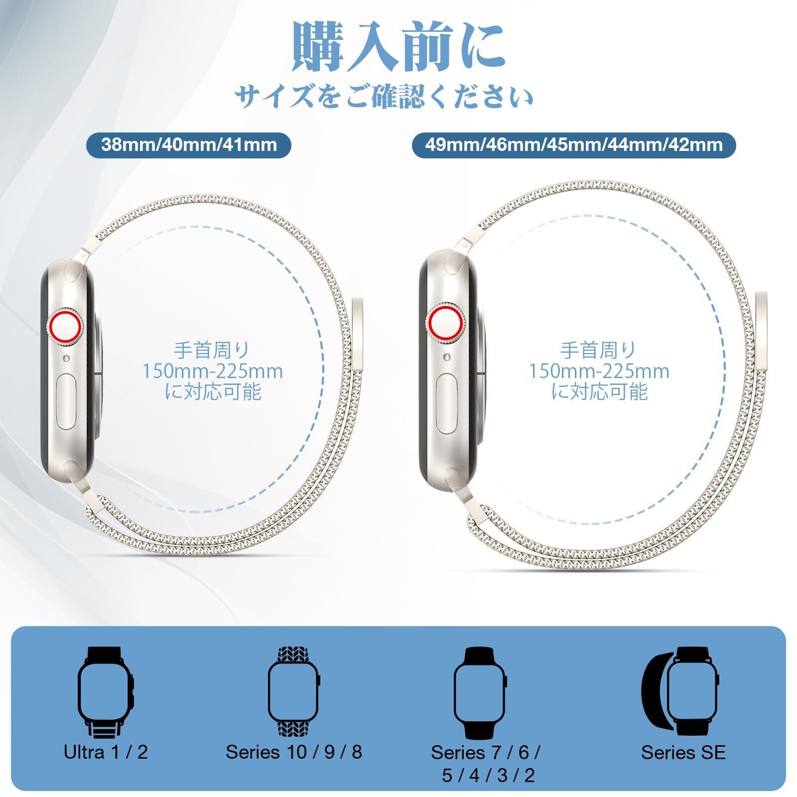 当社のApple Watch用ミラネーゼメッシュループ - スタイルと機能性の素晴らしい組み合わせ。 Apple Watchシリーズ9、8、7、6、5、4、3、2、1、SEに対応しています。 ご購入前に時計のサイズを確認する必要があります。Apple Watch用のApple Watch用ストラップ38mm 40mm 41mm 42mm 44mm 45mm 49mmサイズをご用意しています。 通気性と防汗性のステンレススチール素材で作られたこのストラップは、ワークアウトや日常の活動中に究極の快適さを提供します。 洗練されたエレガントなミラネーゼループデザインで、Apple Watchに洗練されたタッチを加えます。 取り付けと調整が簡単で、ほとんどの手首サイズにフィットするため、男性にも女性にも適しています。 Apple Watchをアップグレードし、ミラネーゼのApple Watchストラップで、これまでにないスタイルと快適さを体験してください。 色あせたり錆びたりせず、アレルギーの問題を引き起こしません。 手首を丁寧に装飾するためだけに慎重に設計されています。 お友達やご家族へのプレゼントにも最適です。