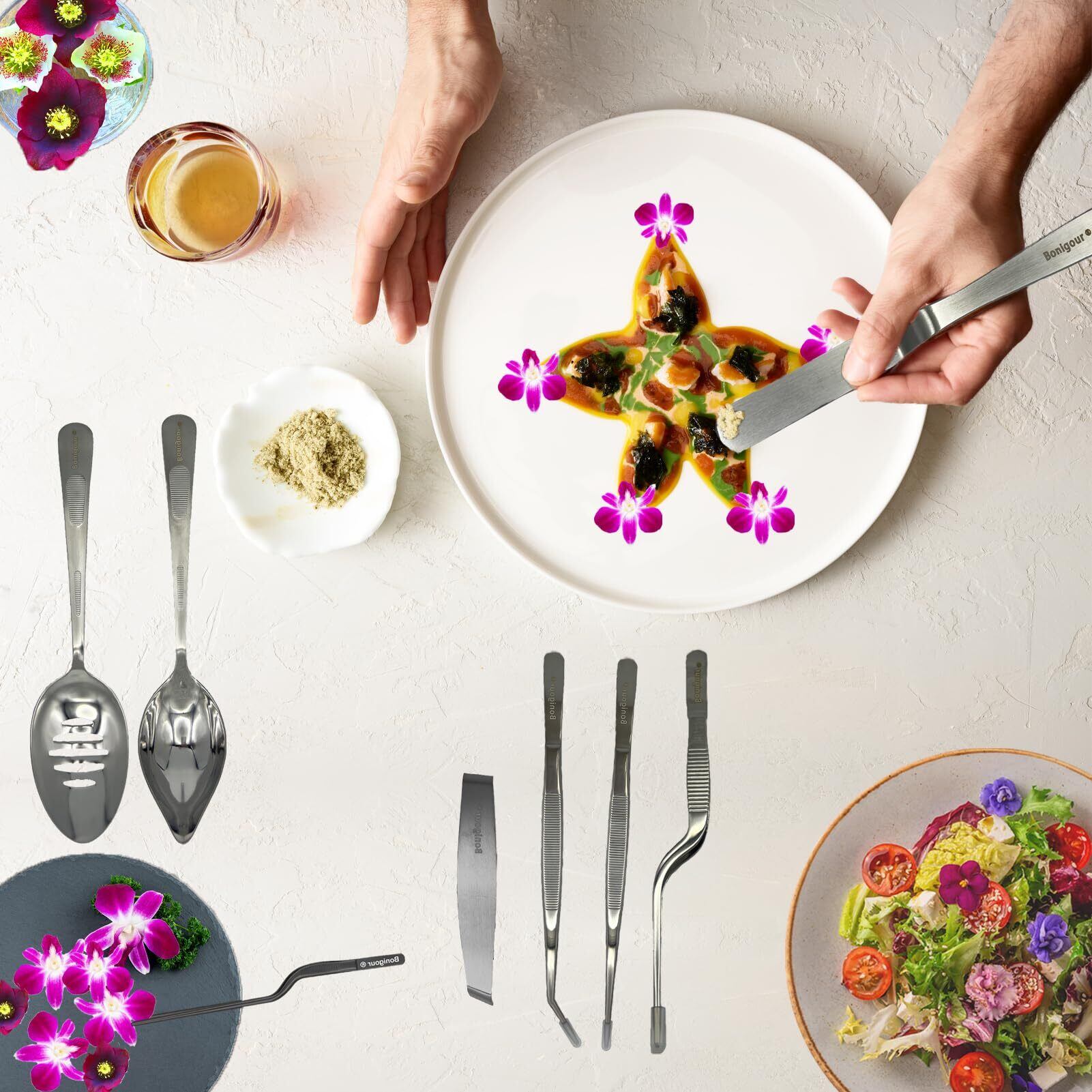 [優れた滑り止めデザイン] Bonigourプロの料理メッキスプーンとメッキピンセットのハンドルは、より良いグリップと安定性のためにマイクロ鋸歯状になっており、最も正確に達成するために、小さなアイテムをつかむと、より良い仕事を維持する