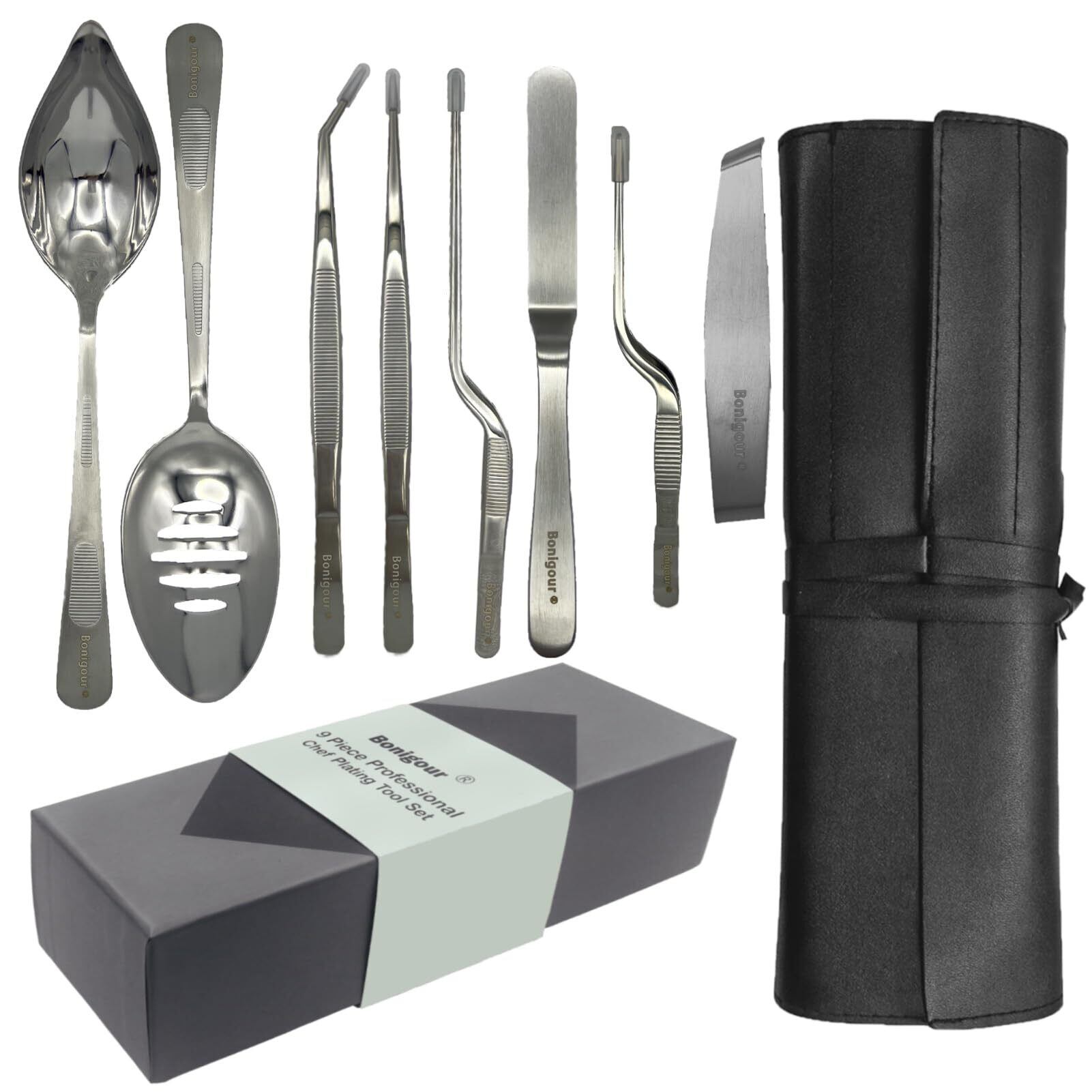 [博尼固尔专业电镀工具套装包括] 1 x 4.7" 鱼骨镊,1 x 8" 弹性偏置铲,1 x 8" 精准偏置镊,1 x 6" 精准偏置镊,1 x 8" 精准尖头弯镊 1 x 8" 精确尖头直镊子、1 x 9" 凹槽碗、1 x 9" 小型锯勺、1 x PU 工具收纳袋、1 x 方巾