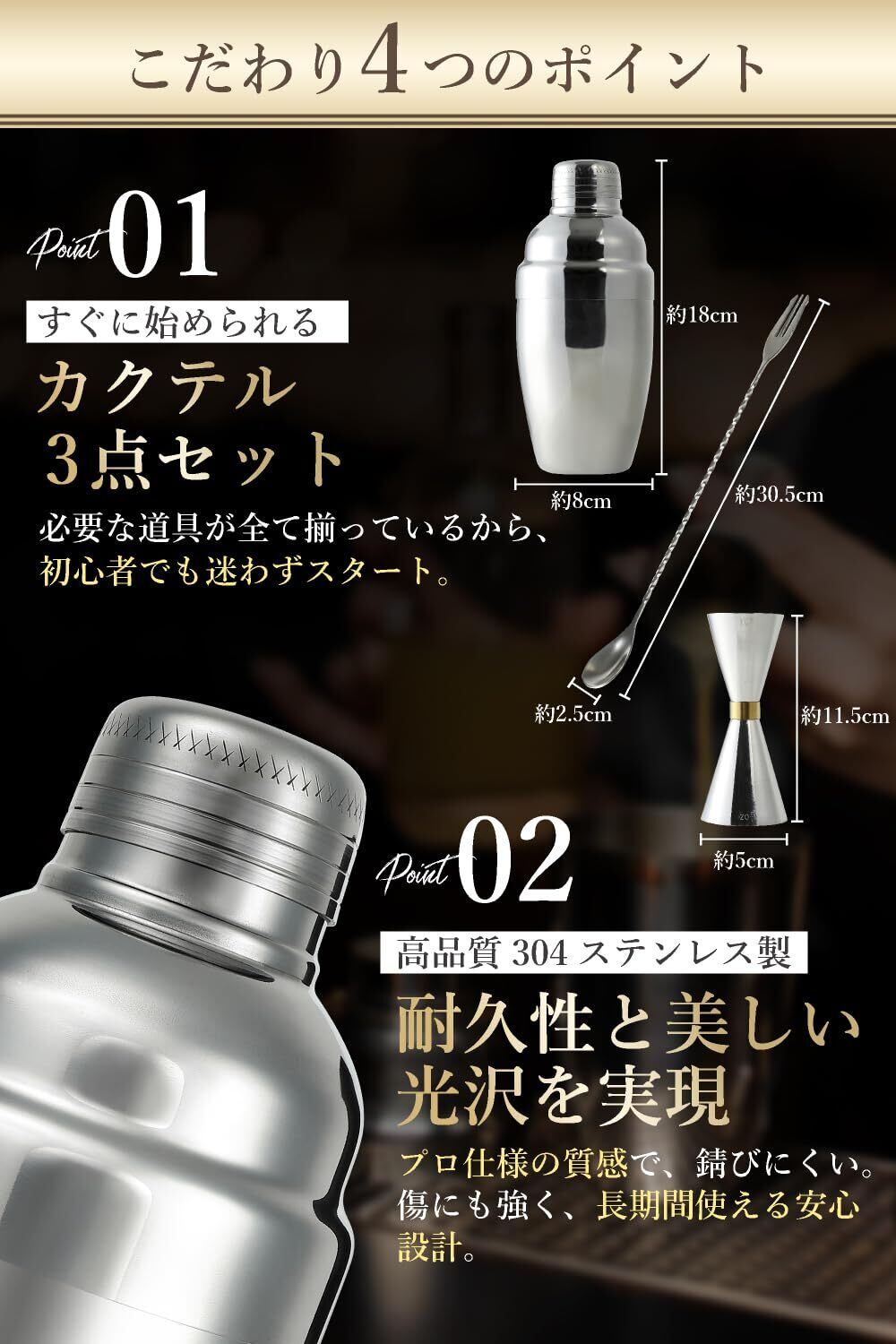【こだわり道具で“ちゃんと本格”を実現】 350mlのステンレス製カクテルシェイカーをはじめ、計量がしやすい30/45mlのメジャーカップ、混ぜやすく注ぎやすいバースプーンをセットにしました。 どれもバーで使われるようなプロ仕様のつくりで、 「自宅用だけど安っぽくないものが欲しい」という方に好評です。