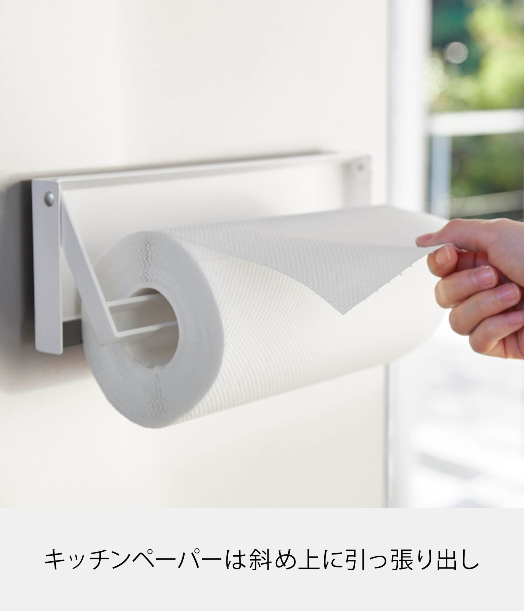 キッチンペーパーロールを差し込むだけ!手前にひっぱって下に引くだけ!大判タイプの海外製キッチンペーパーロールに対応!