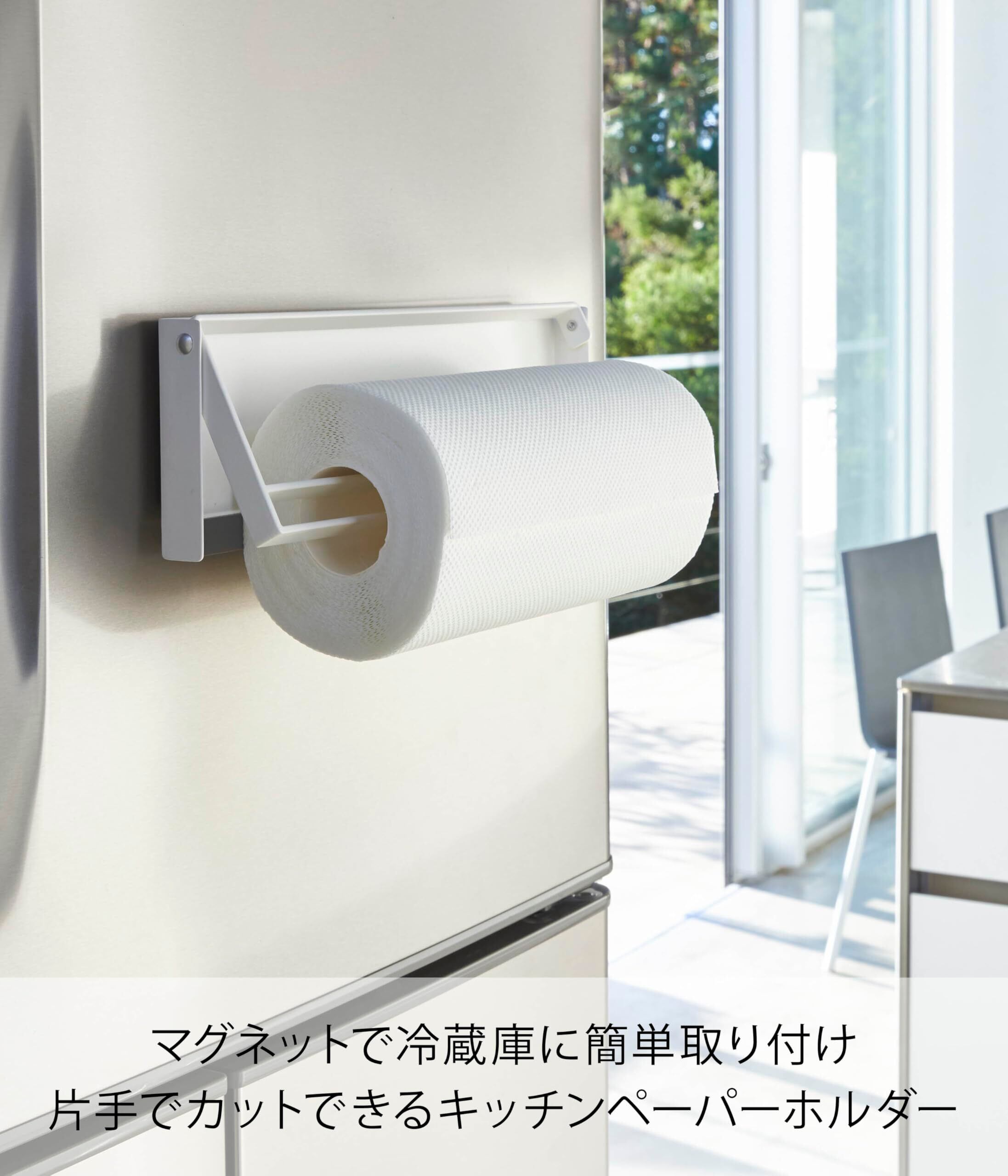 冷蔵庫に強力マグネットで簡単取り付け!片手でカットできるマグネットキッチンペーパーホルダー!シリコーンのストッパーがキッチンペーパーをしっかりキャッチするからカットしやすく、使わないときにはフラットになるので邪魔にならないデザインです。
