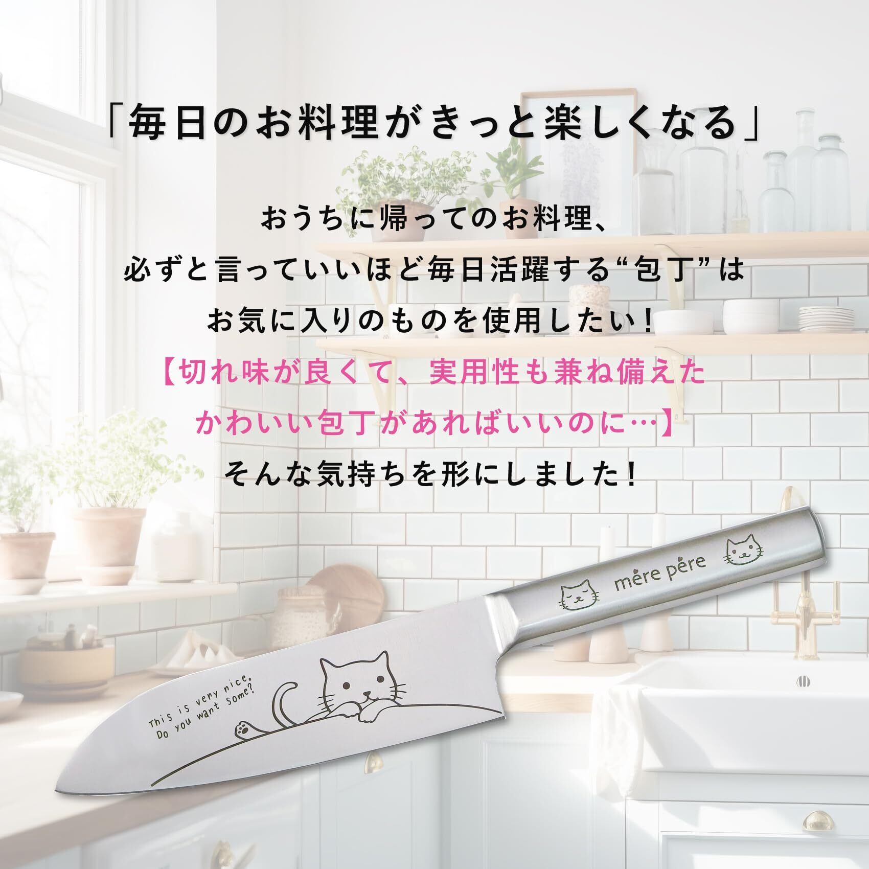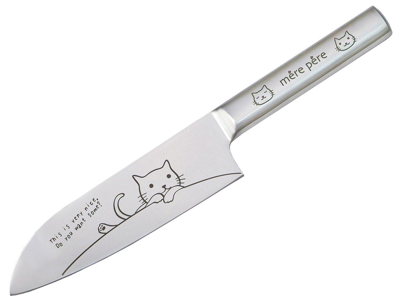 ◆ネコのイラストが入ったかわいいデザインの包丁です。かわいいだけじゃなく、素材にモリブデン鋼を使用していて非常に鋭い切れ味。 毎日活躍する万能サイズの三徳包丁です。