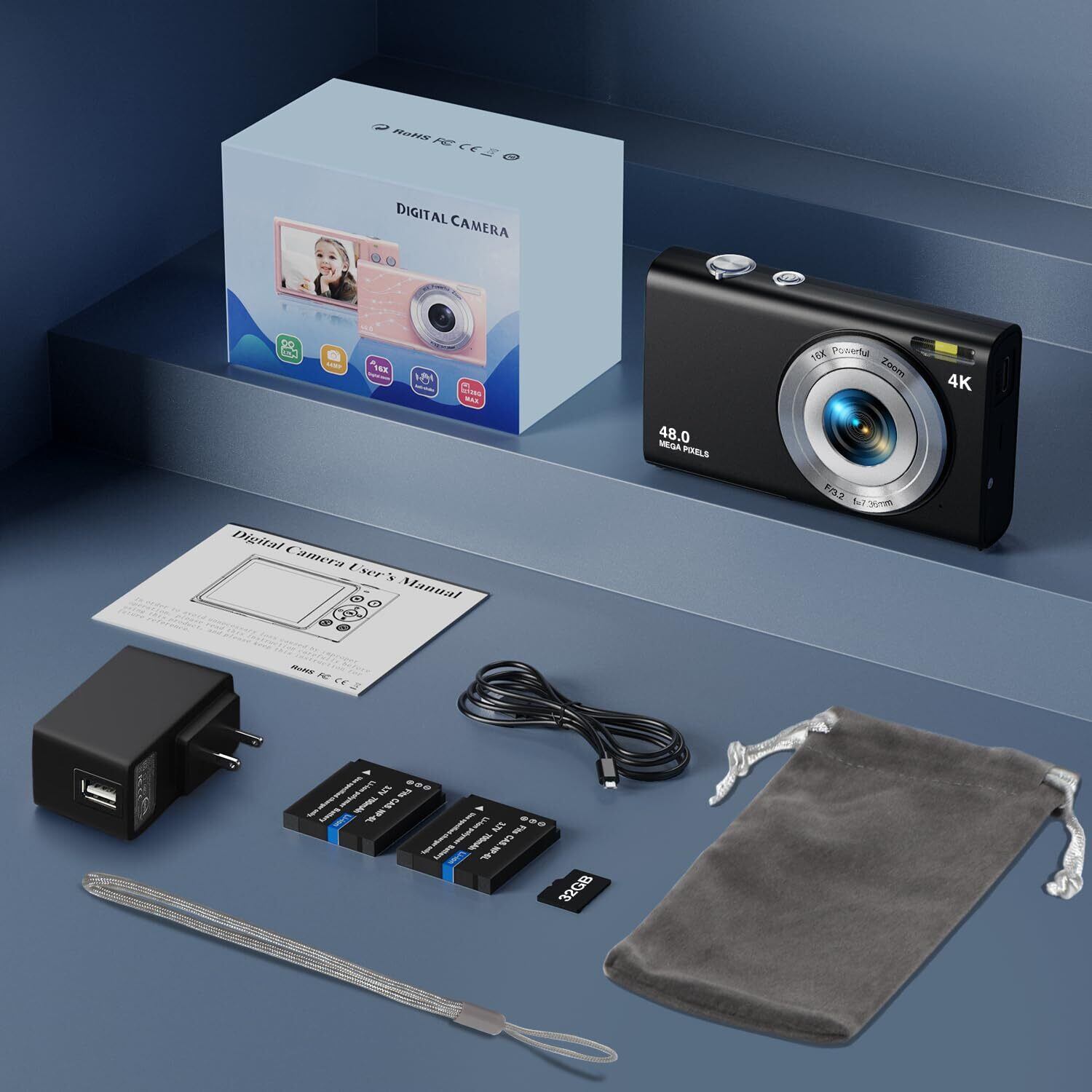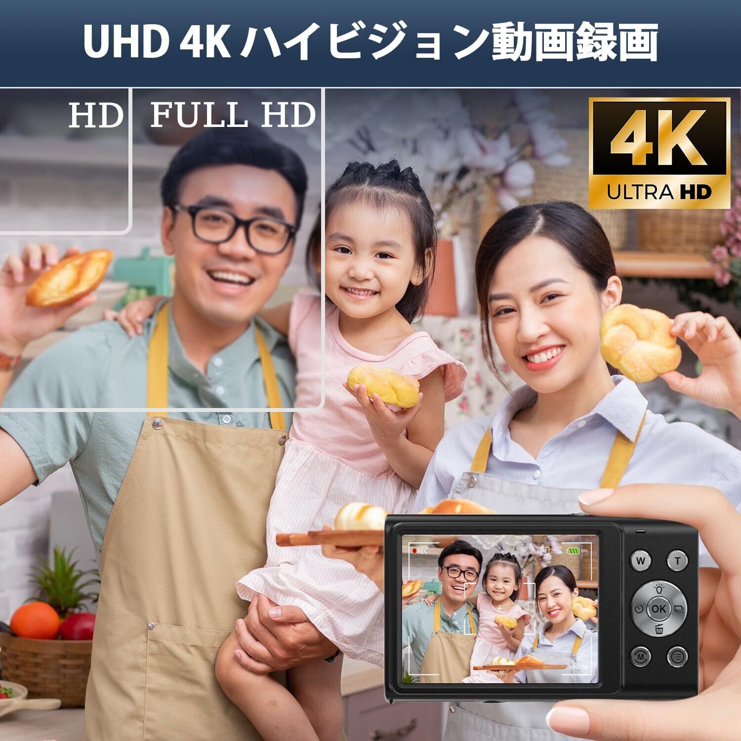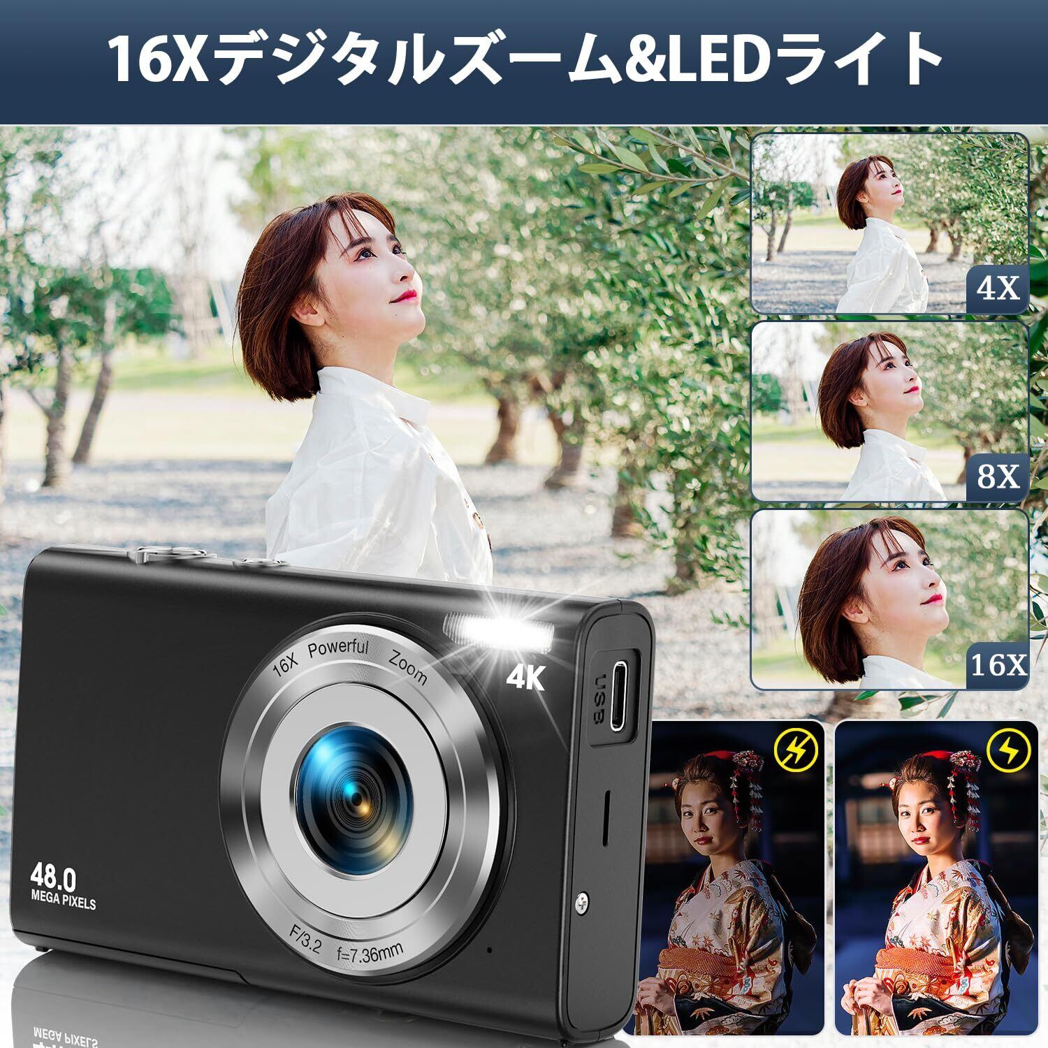 STUOGYUM デジタルカメラ 4K オートフォーカス デジカメ 4800万画素 700mAhバッテリー2個搭載 16倍ズーム ウェブカメラ 手ぶれ補正 顔検出 スマイルキャプチャー 連続撮影 自撮り 2.88インチIPSスクリーン 軽量 小型