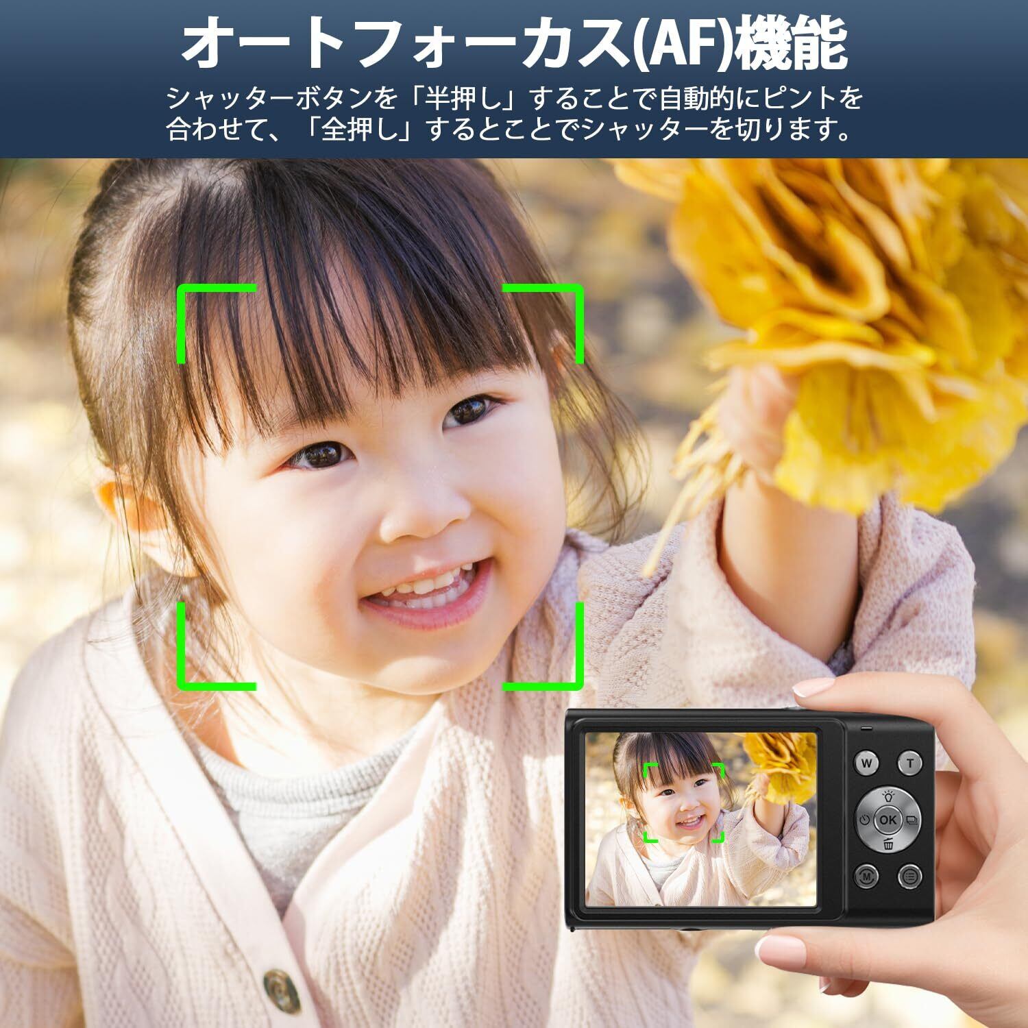 【手ブレ補正機能搭載&16倍デジタルズーム】わずかな手ブレも高精度に補正する「電子手ブレ補正」を搭載。手ブレが起こりやすいズーム撮影時でも、ブレを抑えてキレイに撮影可能です。16倍デジタルズーム機能も搭載しておりますので、W/Tボタンでズームインやズームアウトすることができ、遠い被写体もキレイに撮れます。