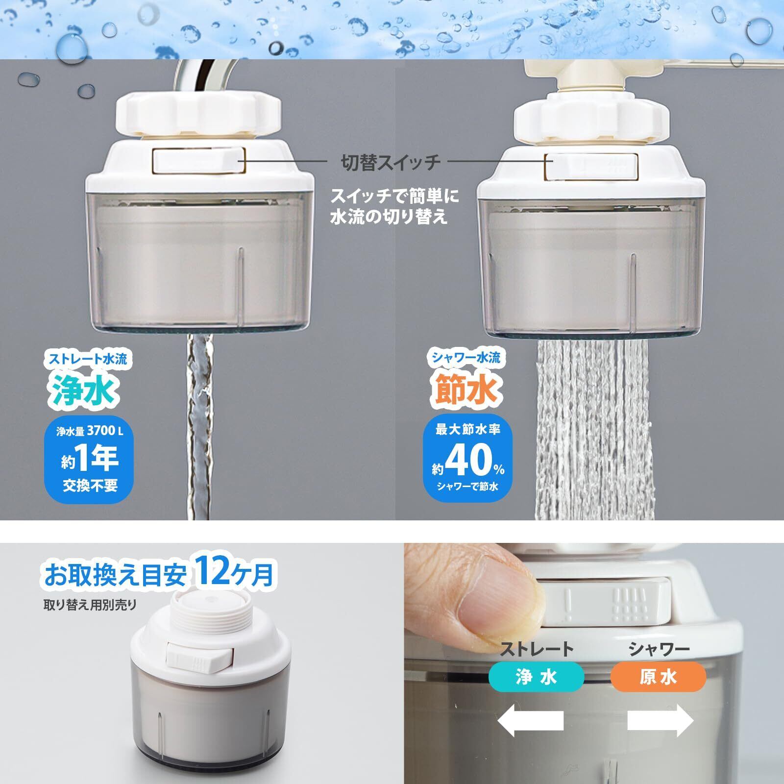浄水量たっぷりの3700L、1日10L使用で1年間交換不要です。