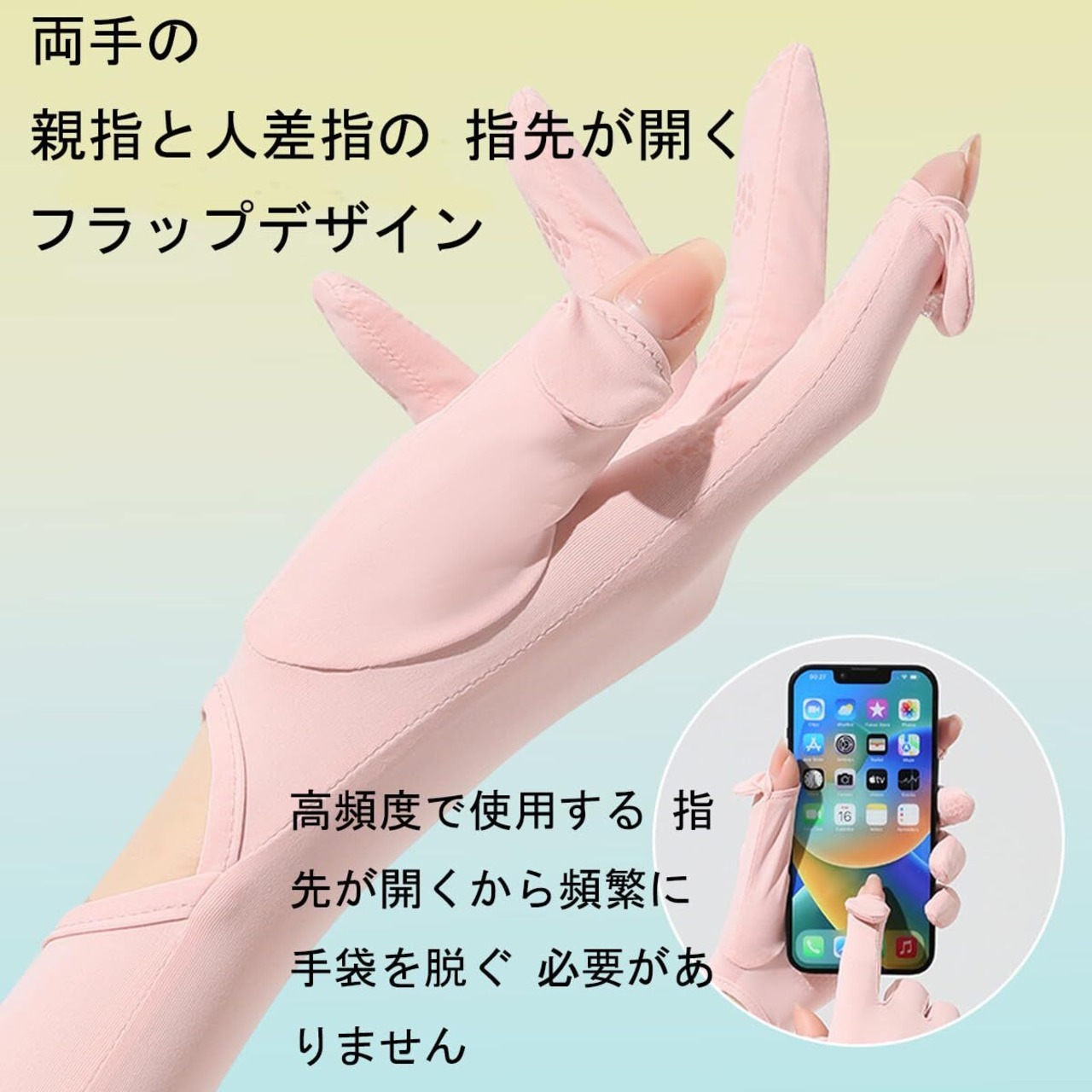 指先までしっかり日焼け止め:手首、親指、人差し指部分は穴空きになっているためすぐに外してスマホなどちょっとした作業や操作が可能です。指出し縫製タイプ(親指と人差し指のみ)ですので、着用しながらもスマホを簡単操作できます。