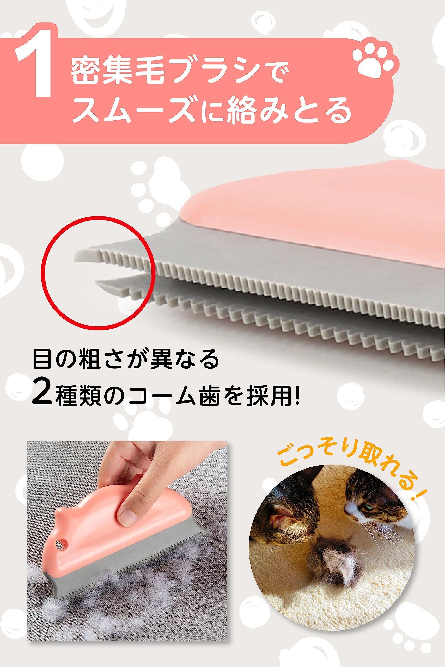 【お手入れ専用ブラシ】掃除機でも粘着テープでも取りずらい抜け毛や毛玉をギザギザ形鋸状ゴムでかき出し集めることができる手のひらサイズのブラシです。ブラシの歯の細かさは2種類あり、長毛でも短毛でもやさしい力でかき集めることができます。電源や電池を使用しないため音や振動もなく、深夜や早朝などの時間でも周囲をきにせずお手入れができます。