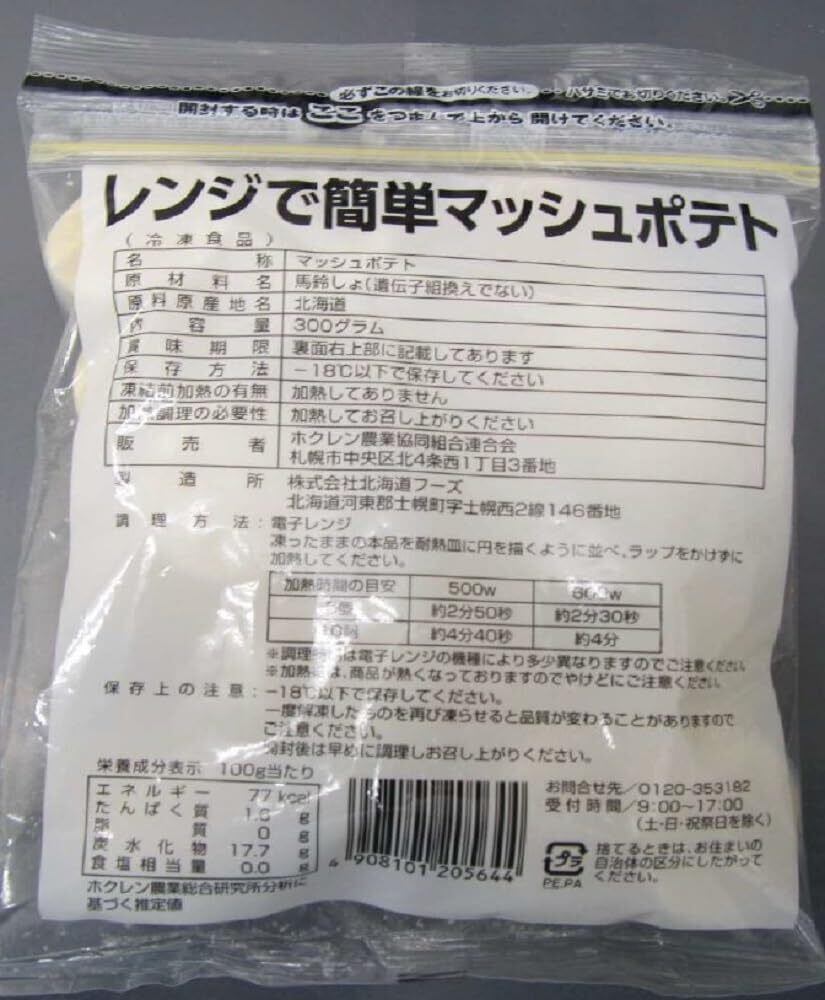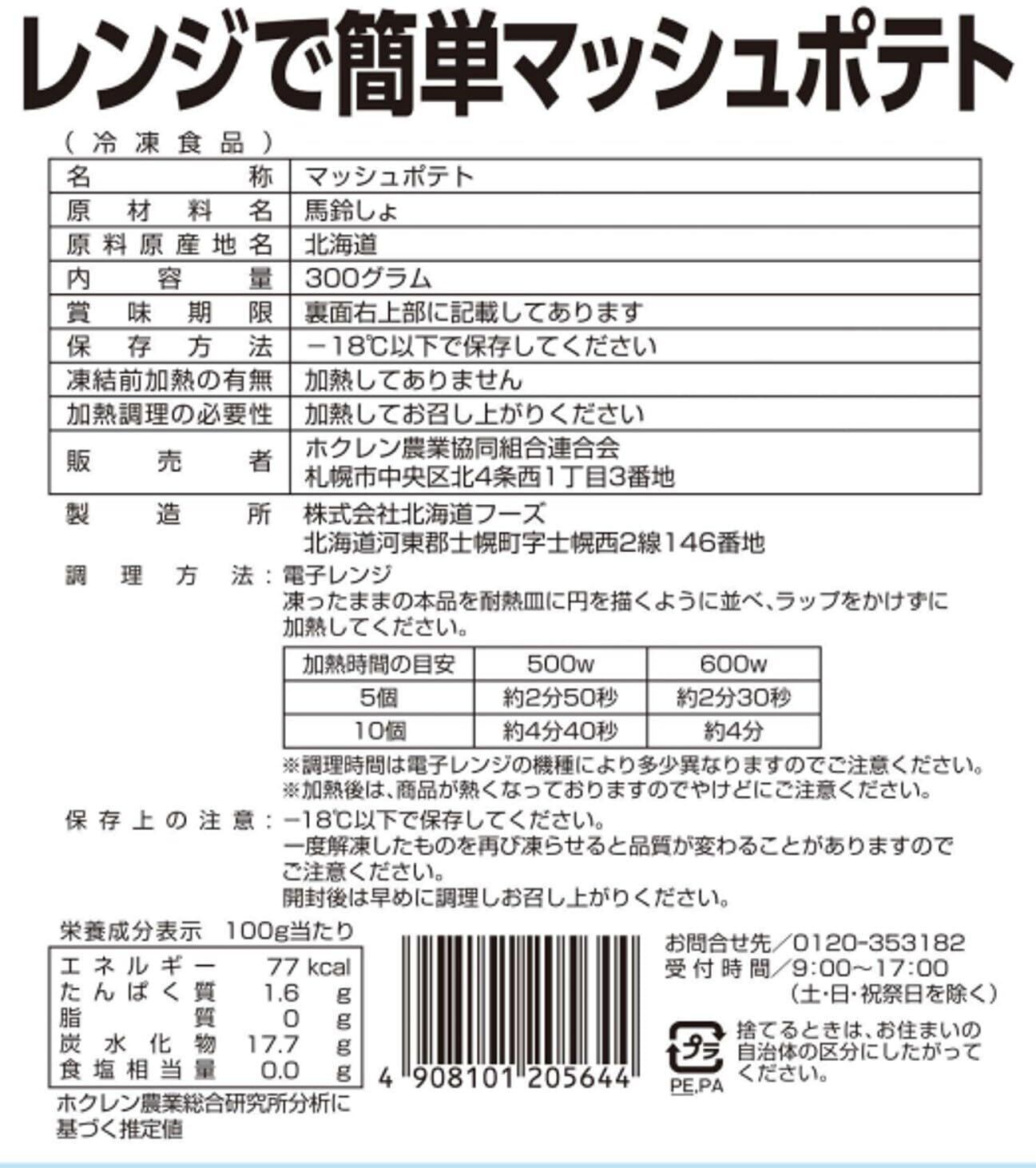①商品特徴:電子レンジで簡単に調理できるマッシュポテトです。 ②お召し上がり方:電子レンジ 凍ったままの本品を耐熱皿に円を描くように並べ、ラップをかけずに加熱してください。 500w:5個 約2分50秒 10個 約4分40秒 600w:5個 約2分30秒 10個 約4分 ③使用・保管上の注意:調理時間は電子レンジの機種により多少異なりますのでご注意ください。 加熱後は、商品が熱くなっておりますのでやけどにご注意ください。 -18℃以下で保存してください。 一度解凍したものを再び凍らせると品質が変わることがありますのでご注意ください。 開封後は早めに調理しお召し上がりください。