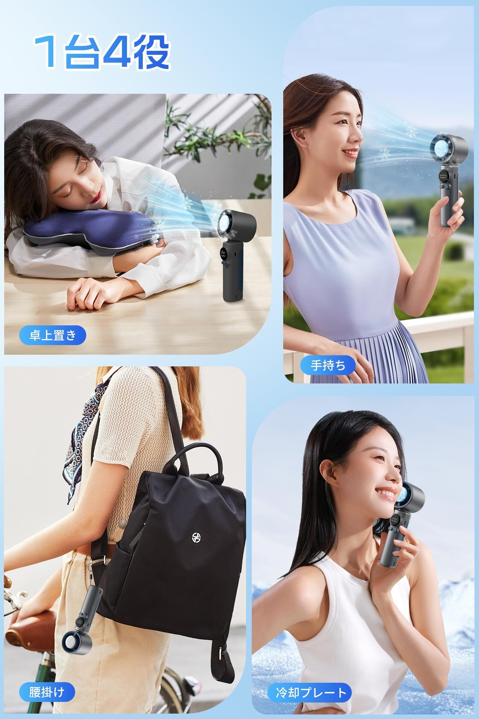 【角度調整可能・これ一台で4WAY】 ファンヘッドは角度を調整することができ、これにより卓上扇風機としての時にも適切な角度に調整して使用することができ、また底部に滑り止めゴム材質を追加し、卓上置き時の安定性を高めた。 一台4役「ハンディファン・卓上扇風機・吊り上げ式・冷感エアコン」、場所は選ばずに3Way使用できますので、通勤通学、スポーツ観戦、花火大会、お祭り、キャンプ、旅行など、室内外問わず、様々なシーンで大活躍ミニファンです。 20db静音運転可能ですので、オフィスでも気軽に使える。