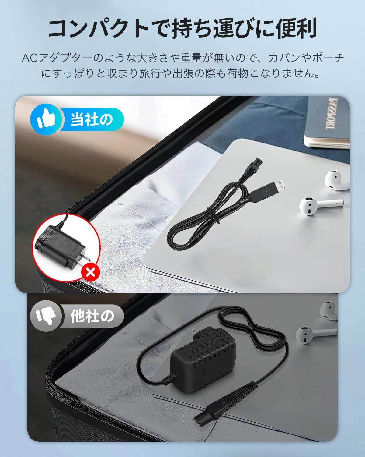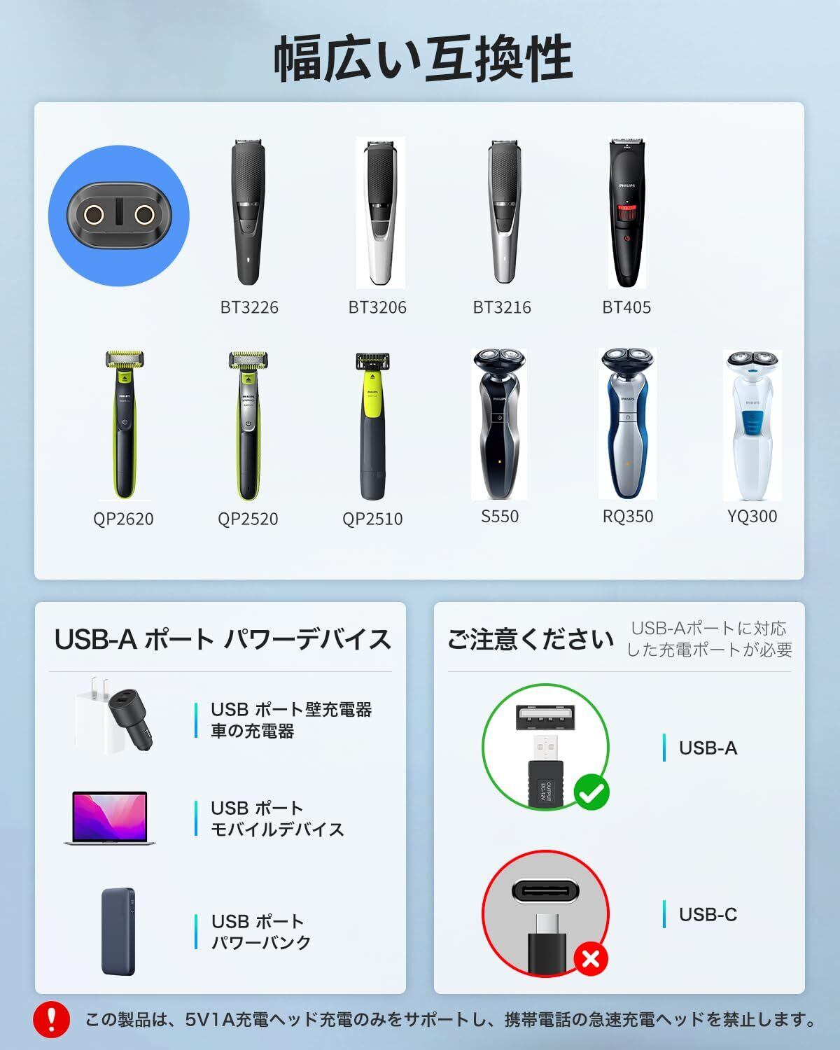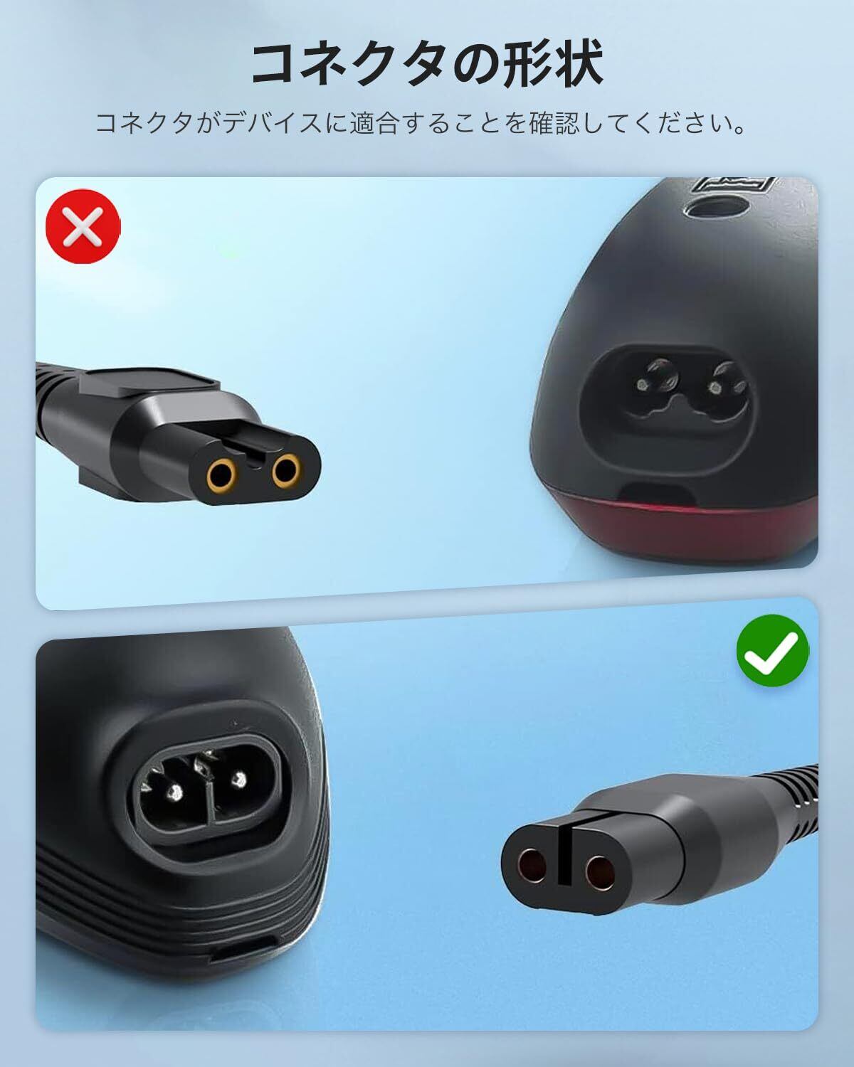 【広い互換性と用途】自宅、会社、旅行、出張など様々な場面で活躍します。4.3V 70mA 充電器 以下のフィリップスシリーズと互換性があります:YQ3シリーズ: YQ300、YQ306、YQ308、YQ316、YQ318。QG3シリーズ: QG3340、QG3250。QPシリーズ QP2520。RQ3シリーズ: RQ350、RQ338、RQ330、RQ328、RQ320、RQ312、RQ311、RQ310、RQ331。S10シリーズ S1010、S1060.S5シリーズ: S510、S511、S512、S520、S530、S531、S538、S500、S550、S551、S526、S528、S529、.S3シリーズ: S300、S311、S301、S321、S330、S331、S360。S1シリーズ: S100、S101、S106、S108、S110、S111、S116、S118。