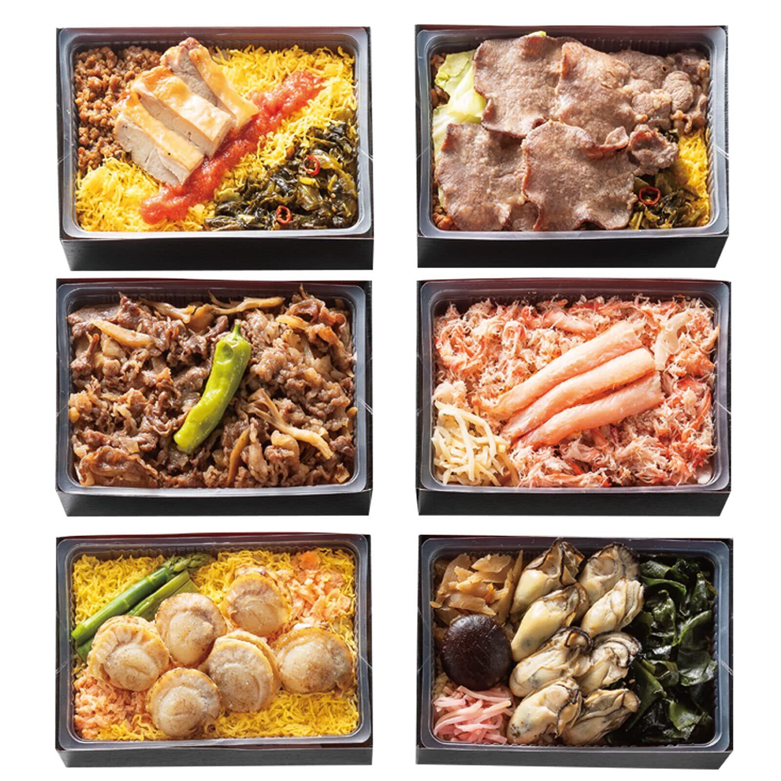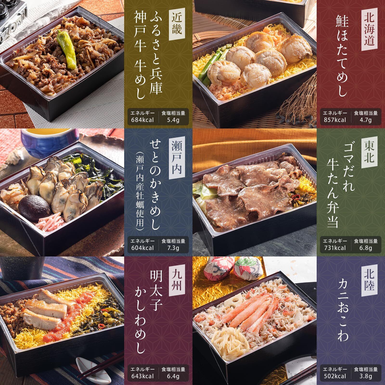 【北海道】鮭ほたてめし【東北】ゴマだれ牛たん弁当【北陸】かにおこわ【近畿】ふるさと兵庫 神戸牛牛めし【瀬戸内】せとのかきめし(瀬戸内海産牡蠣使用)【九州】明太子かしわめし