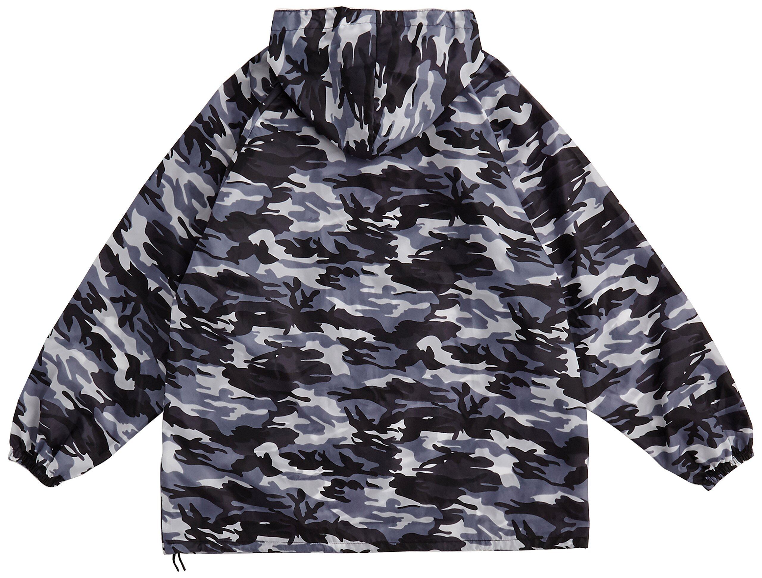 迷彩柄を取り入れたはっ水加工のヤッケです。素材は汚れが付きにくいナイロン100%にはっ水加工を施し、風よけ汚れよけに最適です。アウトドアやサバゲーでウインドブレーカーとして、現場仕事の方や農作業にいつもよりカジュアルなカモフラ柄なんていかがですか?胸部分には小物の収納に便利なポケット付き。しかもひっくり返すと本体を収納できる優れもの。ポケット収納は汚れた面を内側にしまえる仕様になっているので、使った後の持ち運びも便利です。本体も軽くコンパクトに収納可能でき、林間学校やキャンプなどでリュックに準備しておいてもかさばりませんよ。はっ水加工のみで防水加工はしていないため、カッパとしての使用はできませんのでご注意ください。