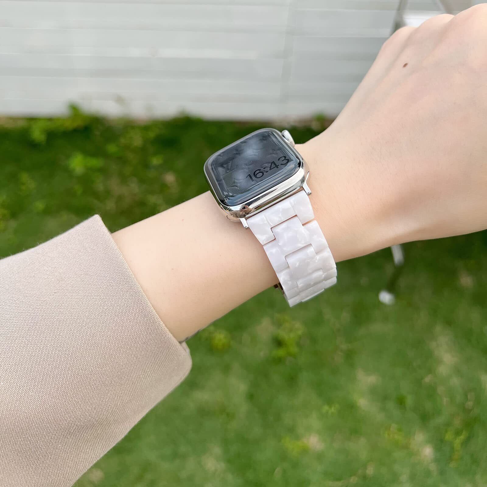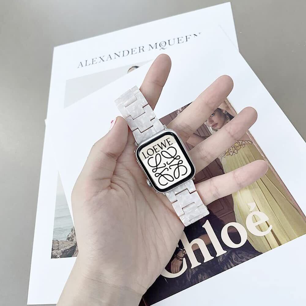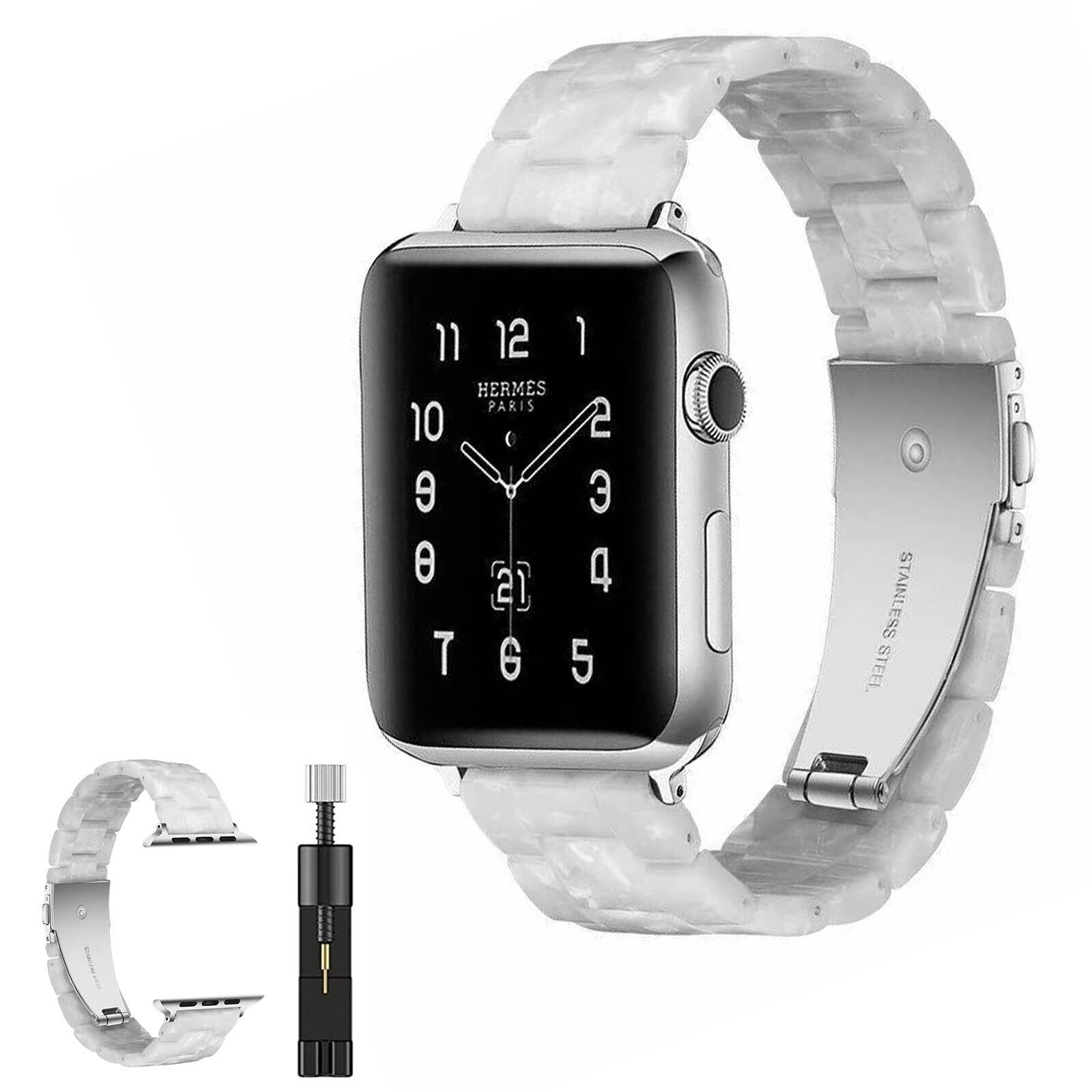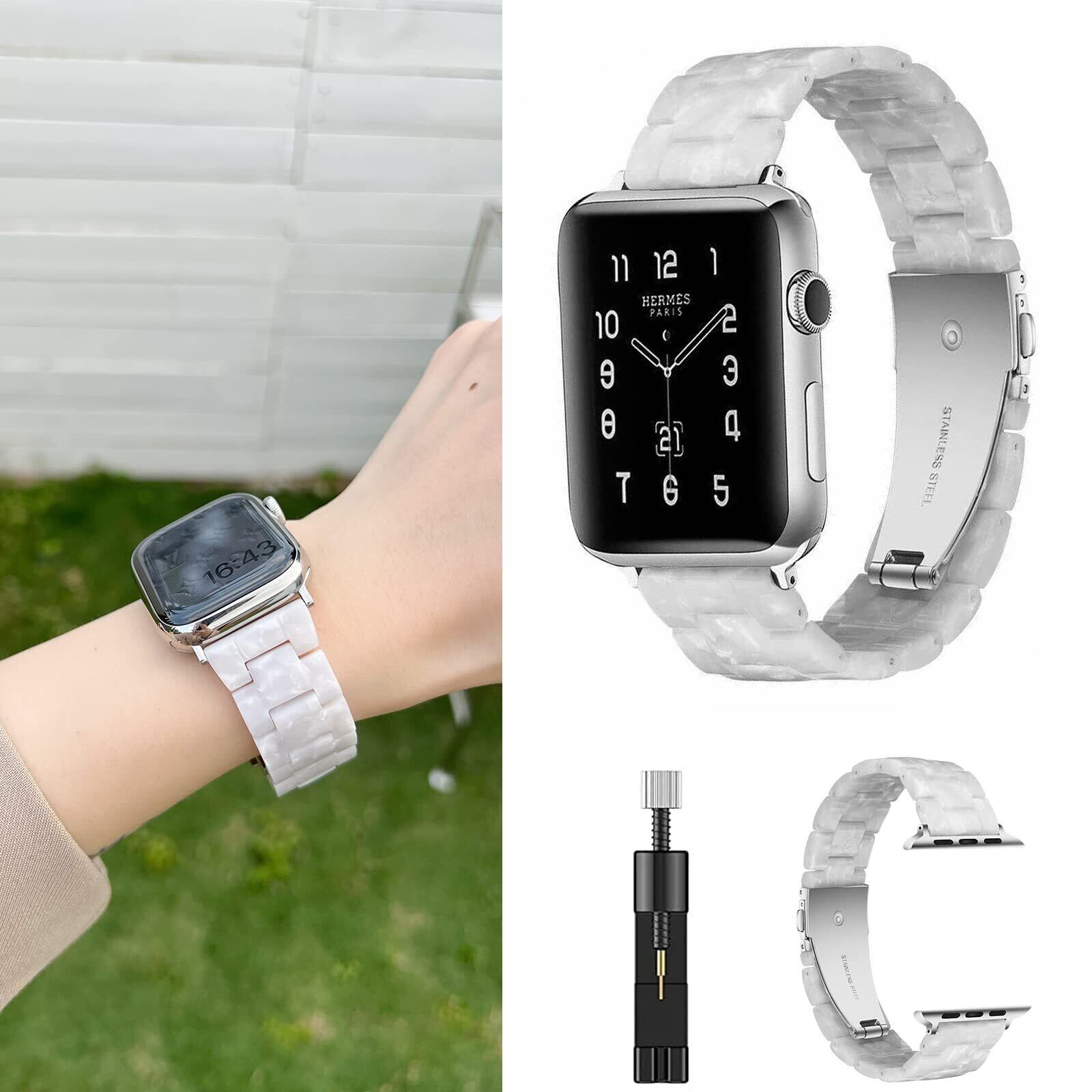 【新型な樹脂材質、軽量と丈夫両立】: このApple Watch バンドはメガネ製造素材として使用される高品質な樹脂材質採用して、ステンレスの金属のベルトより軽く、手首をリラックスさせて圧力がありません。耐衝撃性も優れた、無毒、無味、肌に優しいと曲げ曲げ自由。肌には摩擦しない、快適な使用感。水、衝撃、汚れなどからしっかり守ります。
