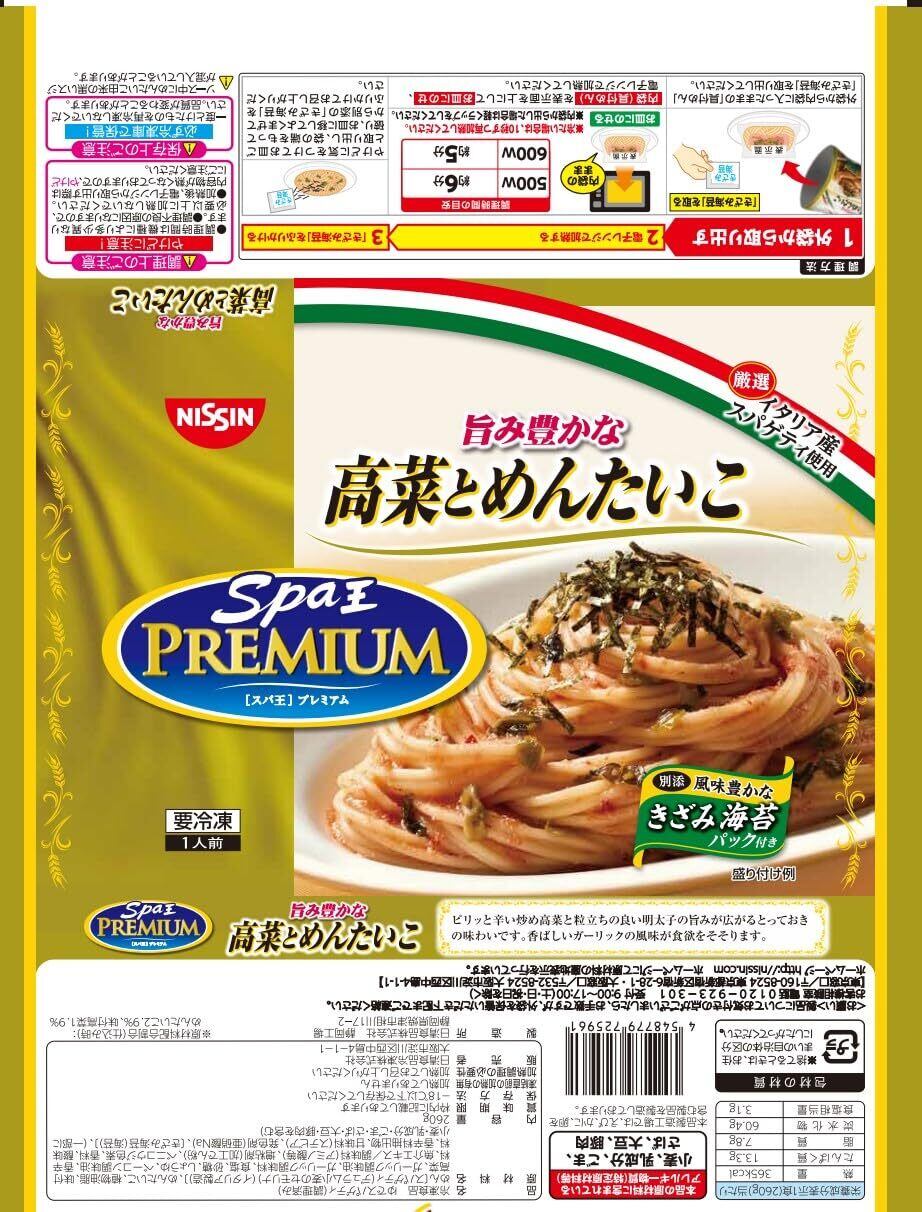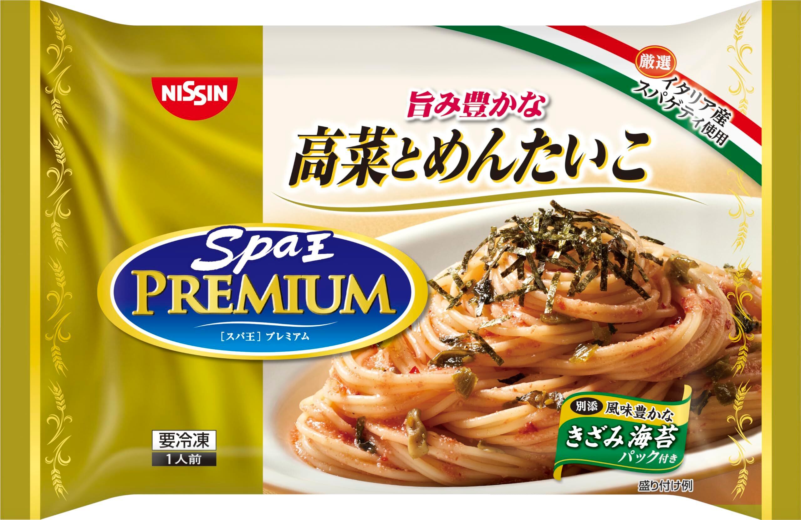 『冷凍 日清スパ王プレミアム』は、リッチで本格的なソース、そして乾麺パスタの食感を楽しむ冷凍パスタのプレミアムブランドです。デュラム小麦のセモリナを100%使用した厳選イタリア産スパゲティを使用しています。ゆで時間は1秒単位でこだわり、プリッとアルデンテ食感にゆで上げました。ピリッと辛い炒め高菜と粒立ちの良い明太子の旨みが広がるとっておきの味わいです。香ばしいガーリックの風味がさらに食欲をそそります。