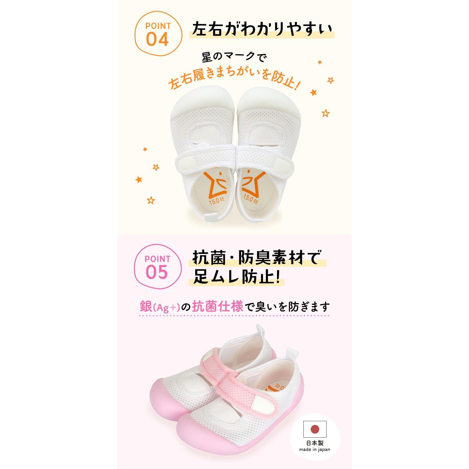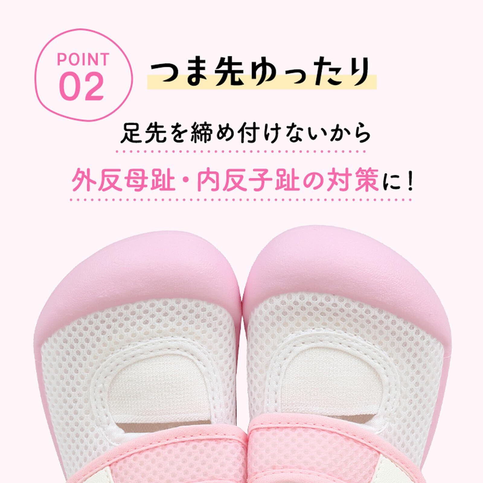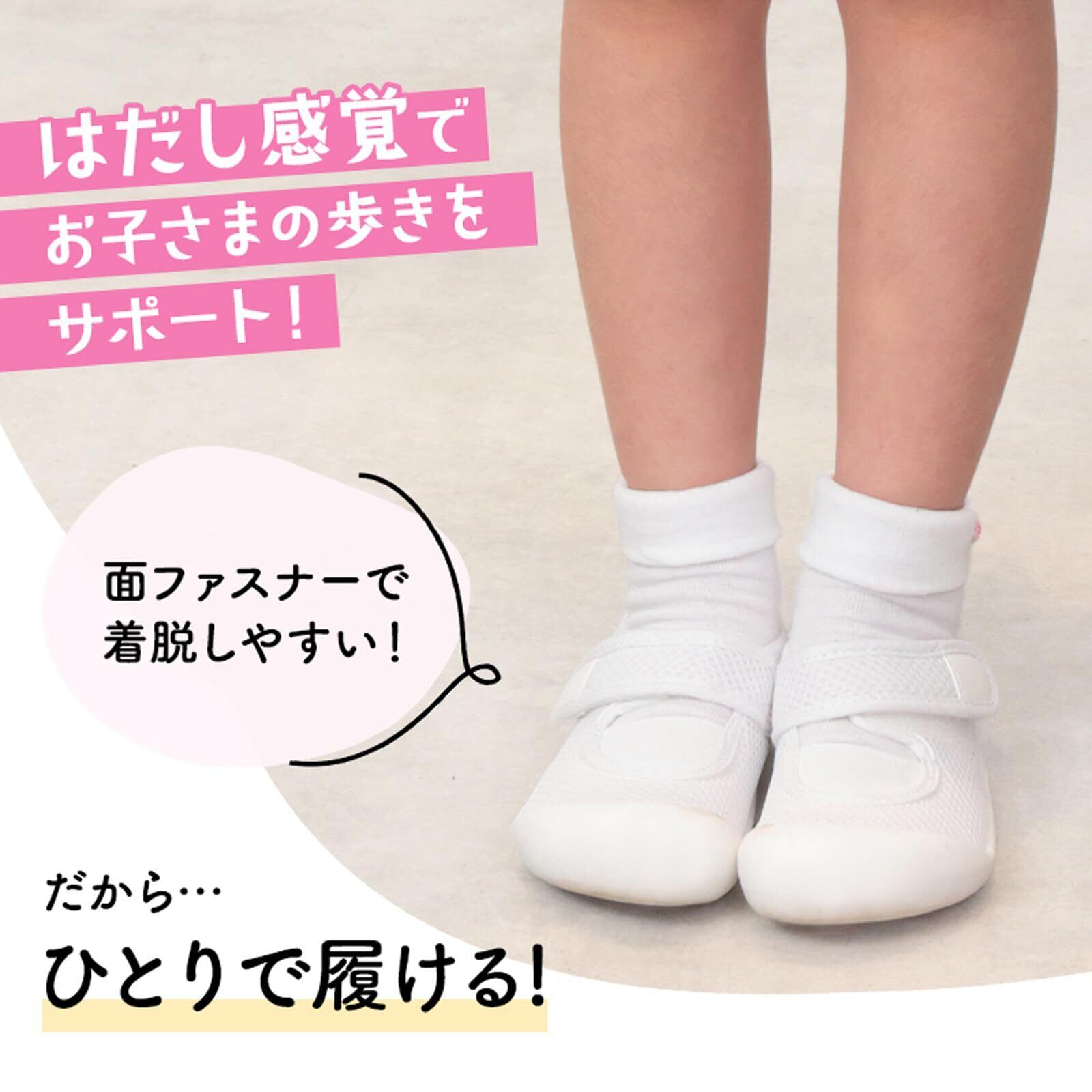 シューズとしての優れた機能性に加え、履き心地にもこだわりました。安心の国産メッシュ素材で通気性に優れ蒸れません。また、抗菌仕様で臭いを防ぎます。かかと部分は、足への衝撃を吸収するクッション、滑り止めなど安全性への細やかな配慮されています。こうした色々な仕掛けと、歩きやすいシューズの必須要件である軽さ・薄さとの両立を実現しました。製品サイズのレンジも広く、お子様の年齢が上がって足が成長する期間ずっと同じ仕様の製品を履き続けることができます。