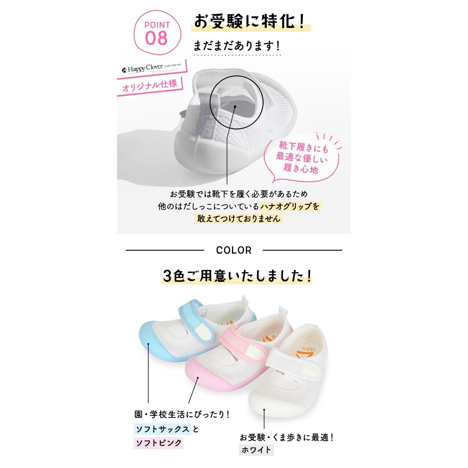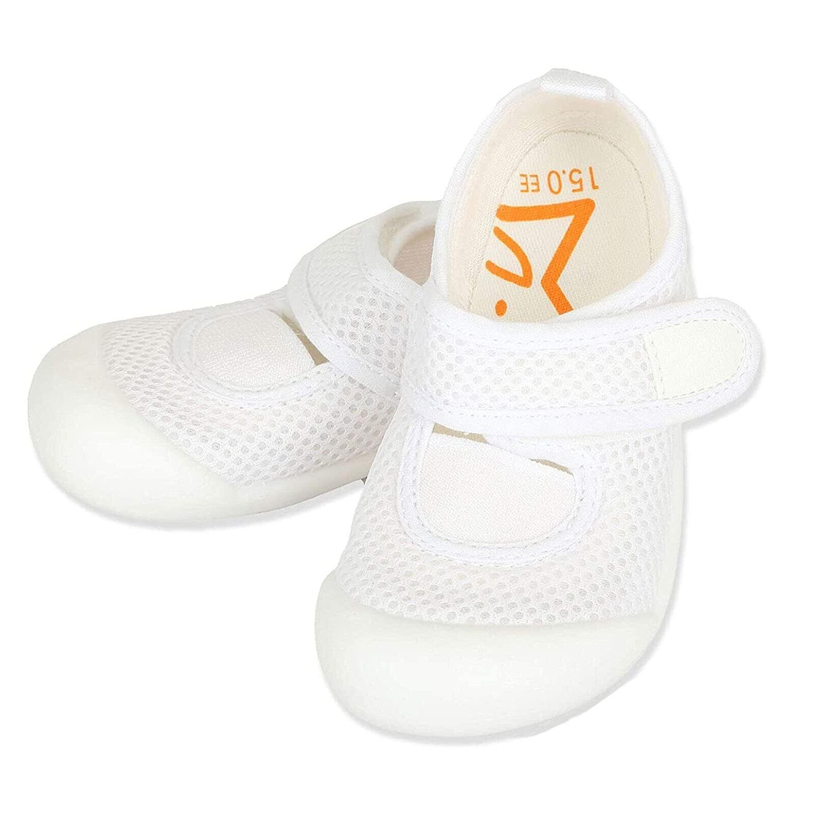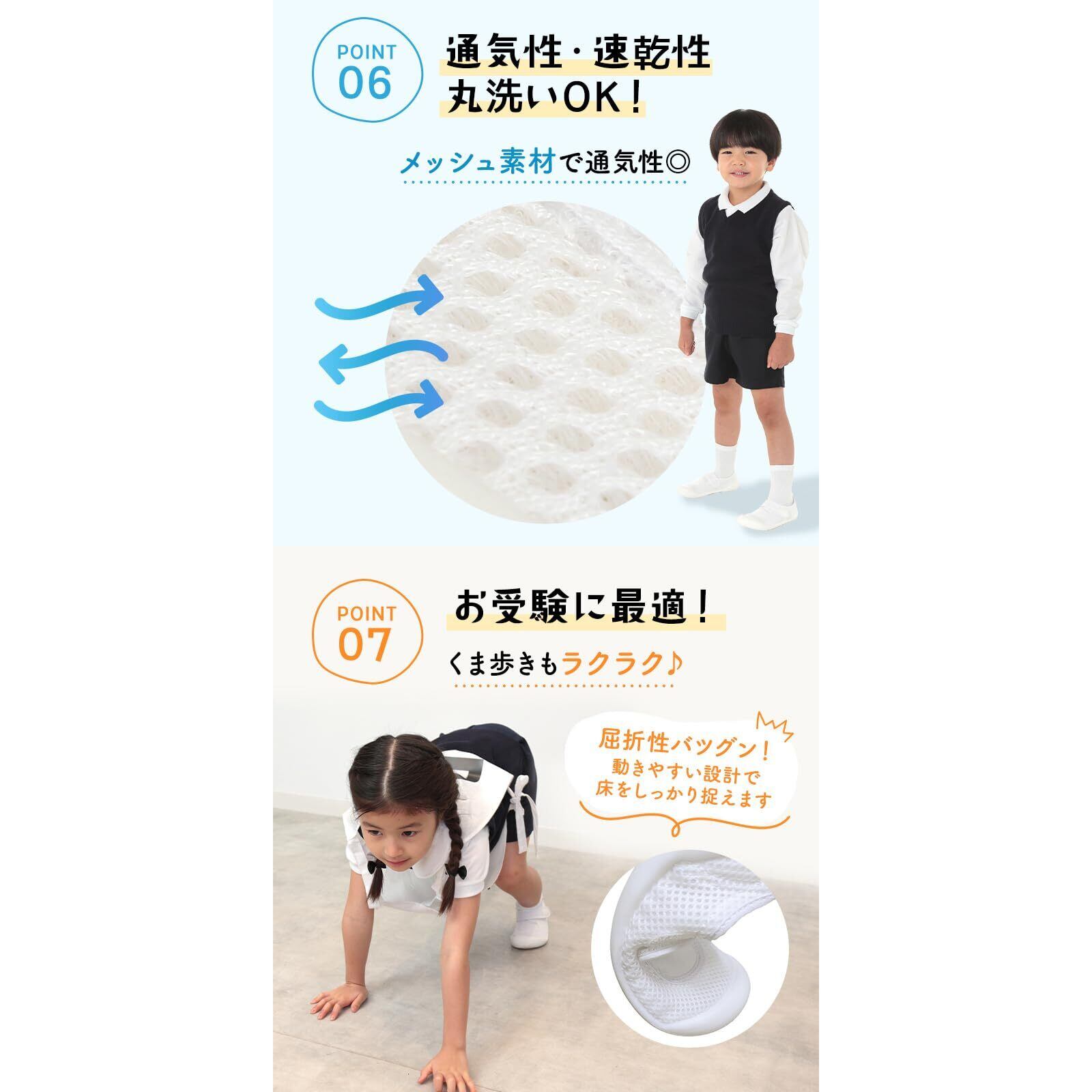シューズとしての優れた機能性に加え、履き心地にもこだわりました。安心の国産メッシュ素材で通気性に優れ蒸れません。また、抗菌仕様で臭いを防ぎます。かかと部分は、足への衝撃を吸収するクッション、滑り止めなど安全性への細やかな配慮されています。こうした色々な仕掛けと、歩きやすいシューズの必須要件である軽さ・薄さとの両立を実現しました。製品サイズのレンジも広く、お子様の年齢が上がって足が成長する期間ずっと同じ仕様の製品を履き続けることができます。