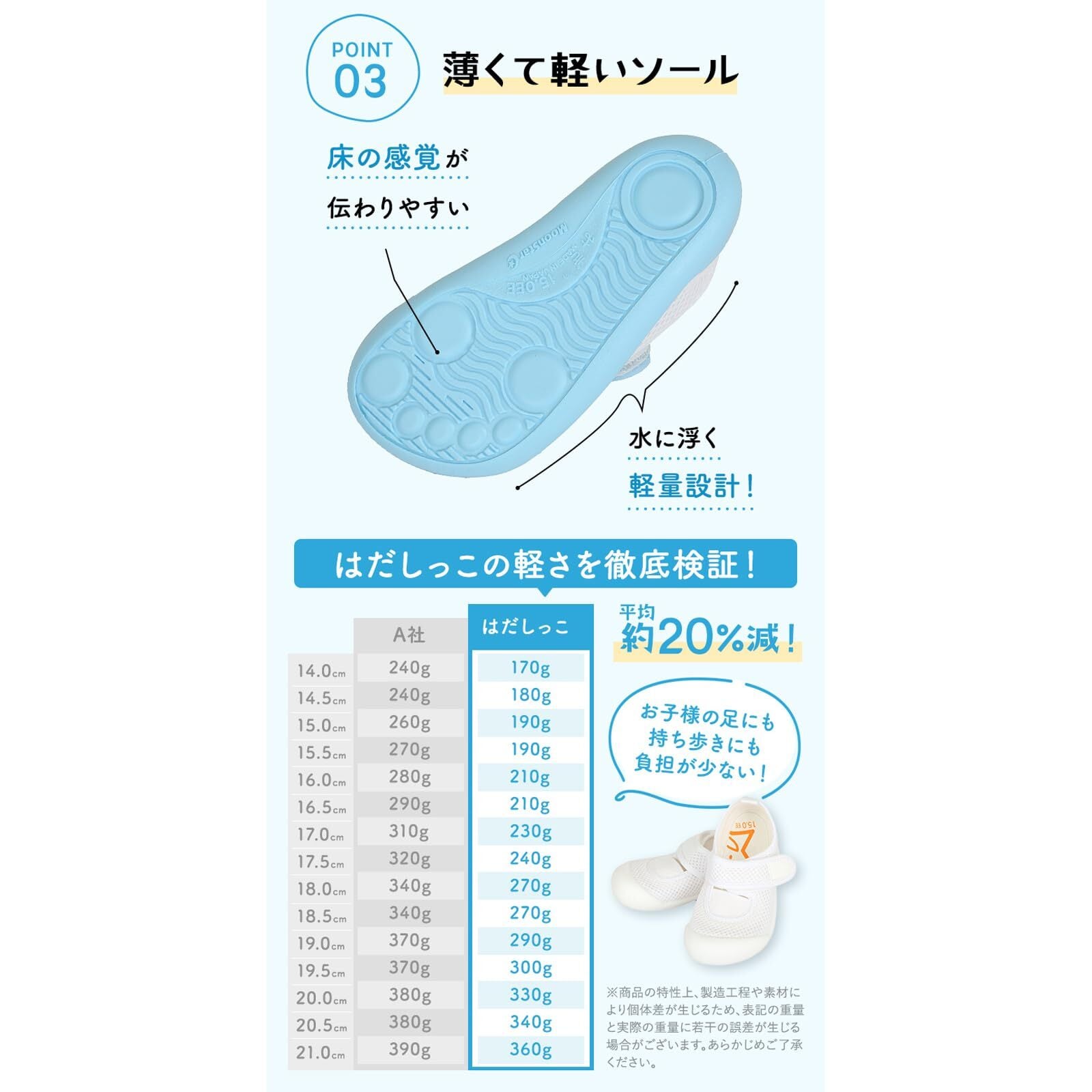 通常のソールに比べて地面の感触が伝わりやすい「薄底」+ 水に浮く「軽量設計」です。