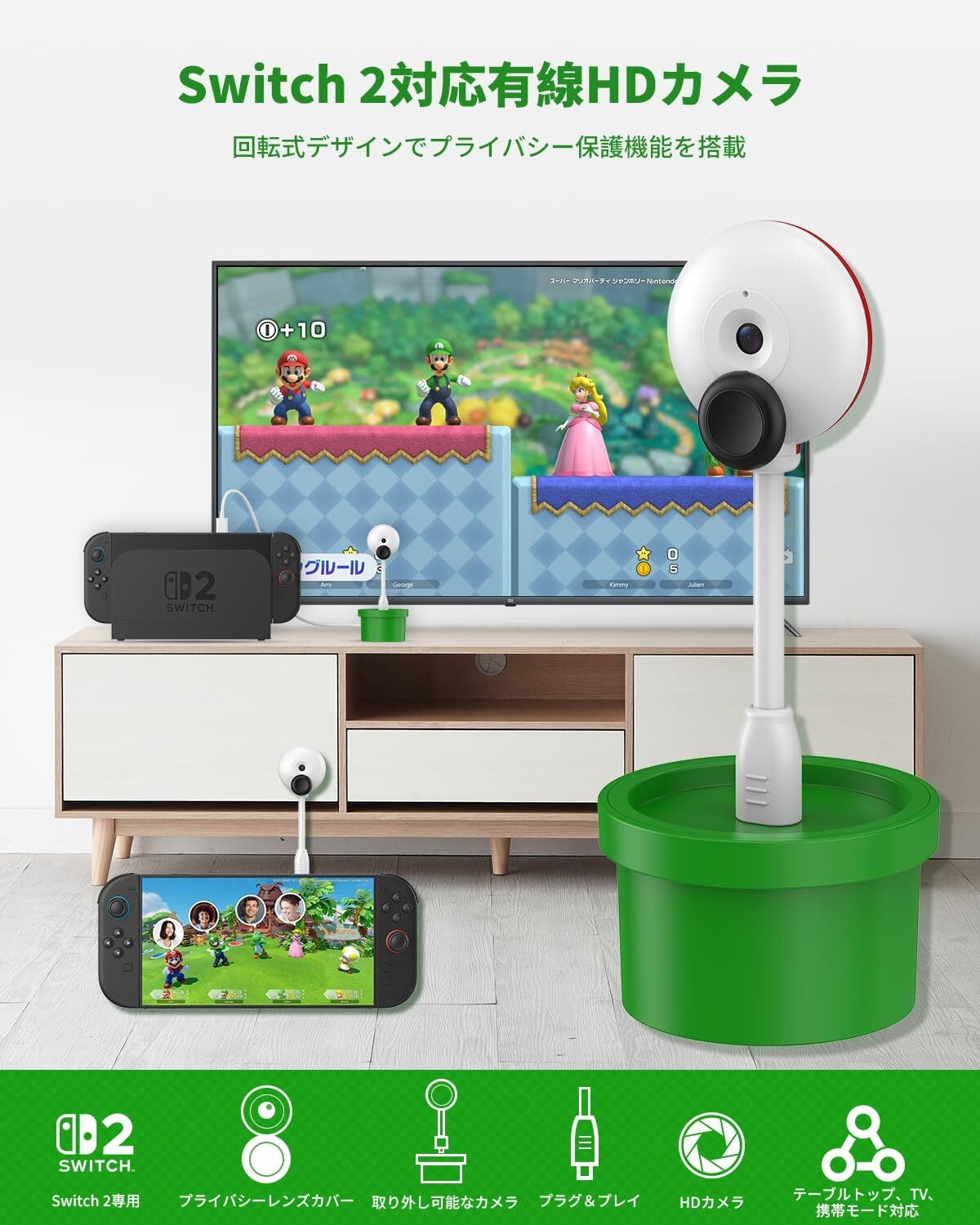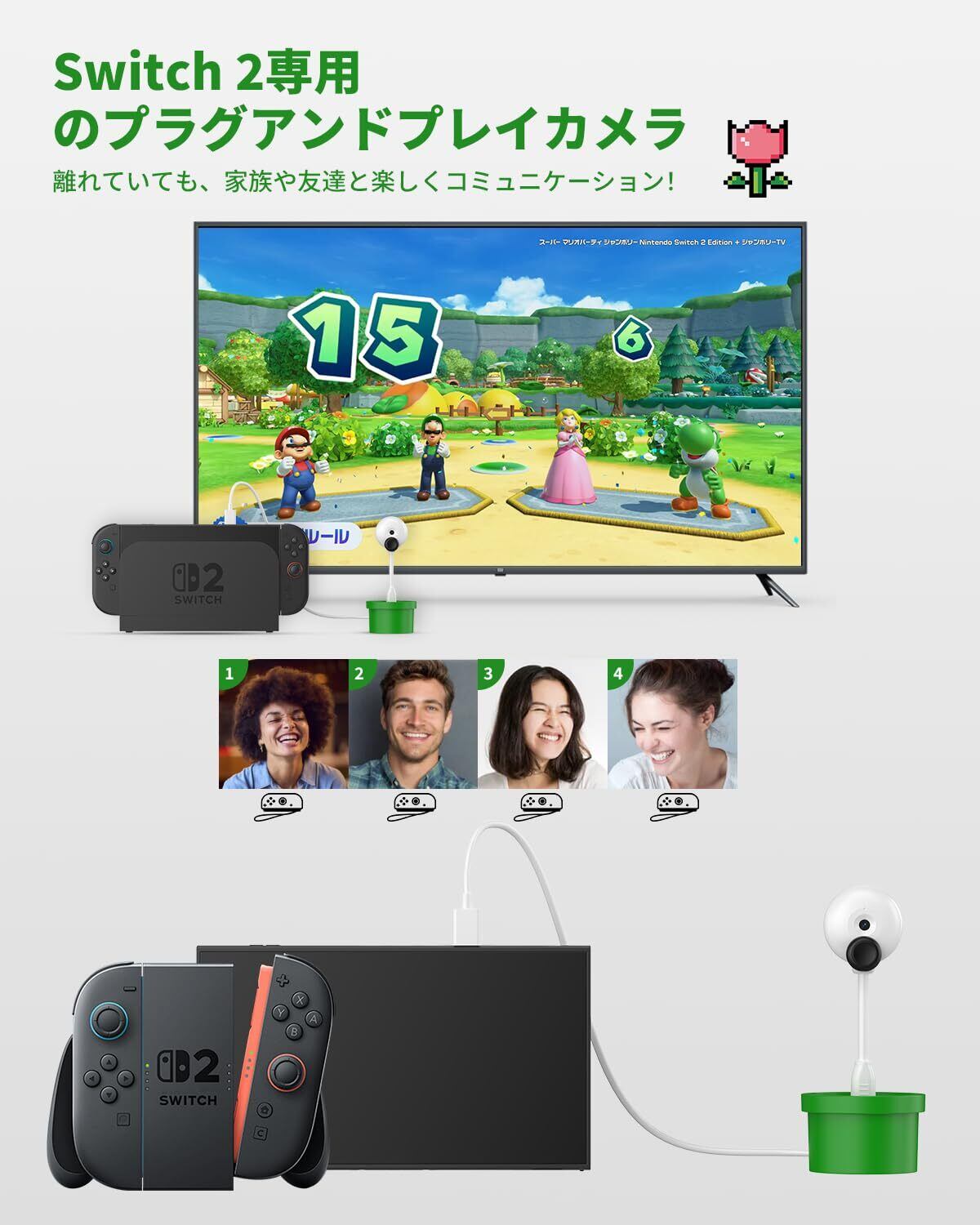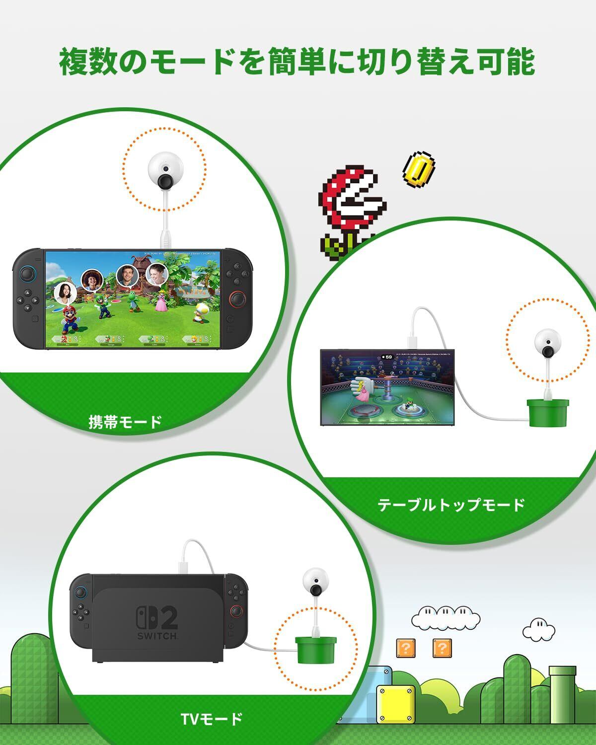 【多機能対応 – Switch 2 用カメラでゲームも配信も】スイッチ2 カメラとして、ゲームインタラクションはもちろん、ビデオ通話やライブ配信など幅広いシーンに対応。専用ベースを使用すれば安定した撮影環境が整い、あらゆる用途に活躍します。