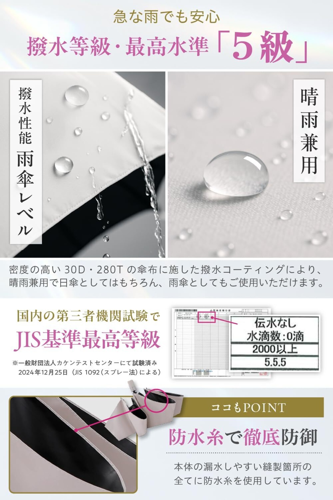 【JIS最高等級の撥水力】撥水等級は雨傘で採用される、最高水準の5級を獲得しております。また、漏水しやすい縫製箇所の全てに防水糸を採用しており、晴雨兼用で急な雨でも安心してご使用いただけます。