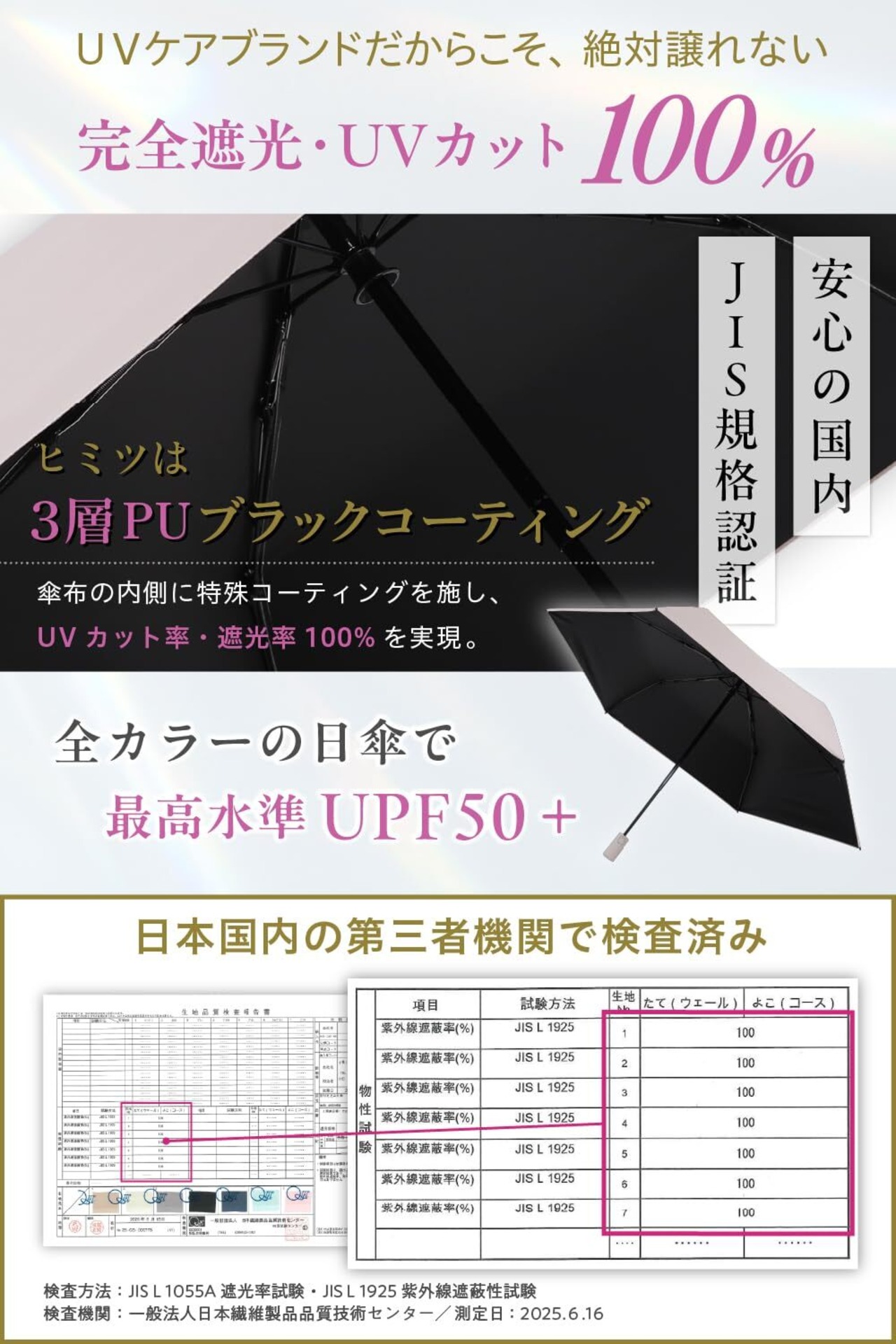 【国内第三者検査機関にてUVカット率100%の実証済】日本の国家規格、JIS規格1925にてUVカット率100%を実証。JIS規格1055にて遮光率100%の実証済み!完全遮光の最高級日傘です。