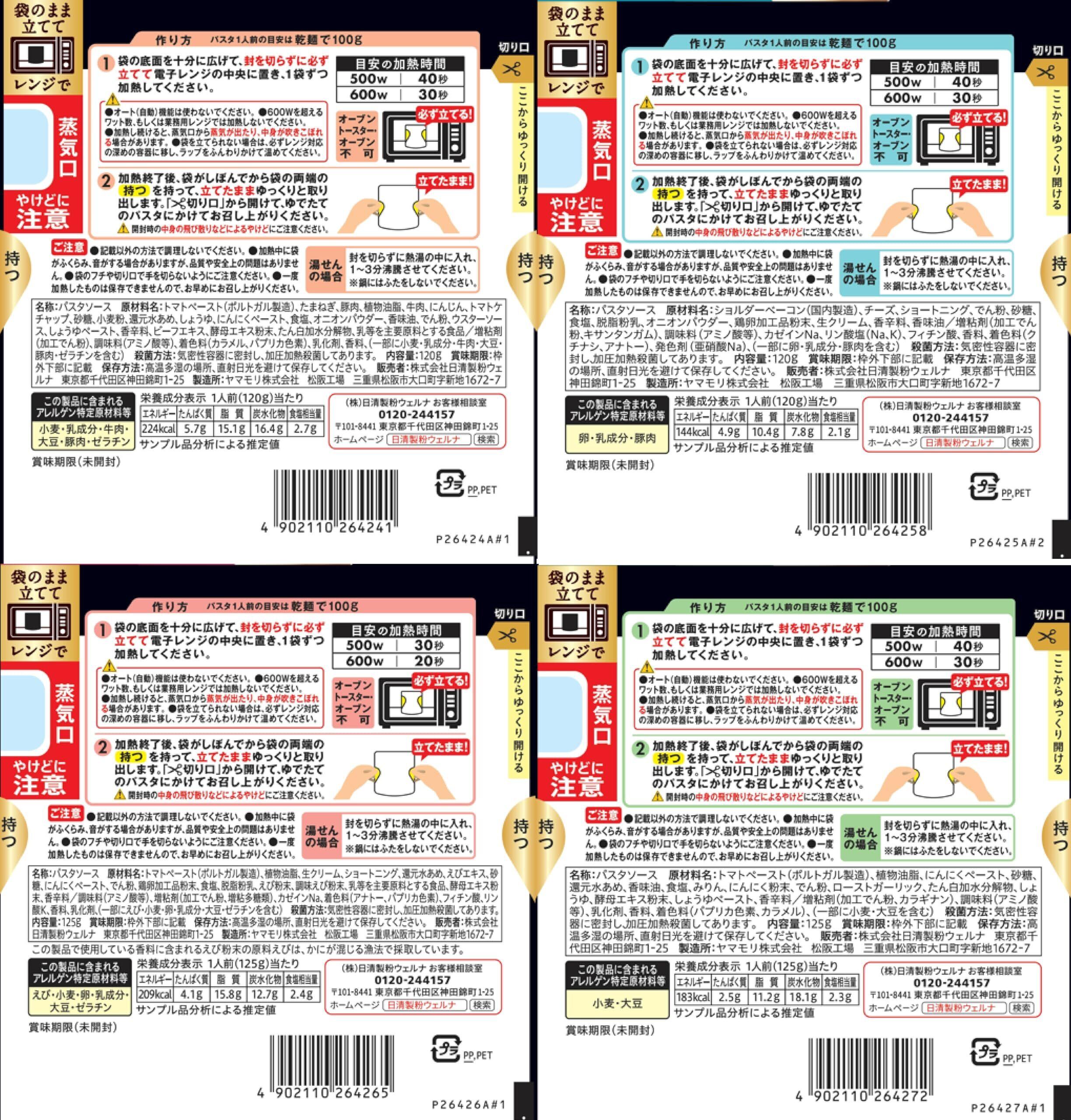 【マ・マー TAPPRINO ボロネーゼ】トマトペースト(ポルトガル製造)、たまねぎ、豚肉、植物油脂、牛肉、にんじん、トマトケチャップ、砂糖、小麦粉、還元水あめ、しょうゆ、にんにくペースト、食塩、オニオンパウダー、香味油、でん粉、ウスターソース、しょうゆペースト、香辛料、ビーフエキス、酵母エキス粉末、たん白加水分解物、乳等を主要原料とする食品/増粘剤(加工でん粉)、調味料(アミノ酸等)、着色料(カラメル、パプリカ色素)、乳化剤、香料、(一部に小麦・乳・牛肉・大豆・豚肉・ゼラチンを含む)【マ・マー TAPPRINO カルボナーラ】ショルダーベーコン(国内製造)、チーズ、ショートニング、でん粉、砂糖、食塩、脱脂粉乳、オニオンパウダー、鶏卵加工品粉末、生クリーム、香辛料、香味油/増粘剤(加工でん粉、キサンタンガム)、調味料(アミノ酸等)、カゼインNa、リン酸塩(Na、K)、フィチン酸、香料、着色料(クチナシ、アナトー)、発色剤(亜硝酸Na)、(一部に卵・乳・豚肉を含む)【マ・マー TAPPRINO 海老のトマトクリーム】トマトペースト(ポルトガル製造)、植物油脂、生クリーム、ショートニング、還元水あめ、えびエキス、砂糖、にんにくペースト、でん粉、鶏卵加工品粉末、食塩、脱脂粉乳、えび粉末、調味えび粉末、乳等を主要原料とする食品、酵母エキス粉末、香辛料/調味料(アミノ酸等)、増粘剤(加工でん粉、増粘多糖類)、カゼインNa、着色料(アナトー、パプリカ色素)、フィチン酸、リン酸K、香料、乳化剤、(一部にえび・小麦・卵・乳・大豆・ゼラチンを含む)【マ・マー TAPPRINO ガーリックトマト】トマトペースト(ポルトガル製造)、植物油脂、にんにくペースト、砂糖、還元水あめ、香味油、食塩、みりん、にんにく粉末、でん粉、ローストガーリック、たん白加水分解物、しょうゆ、酵母エキス粉末、しょうゆペースト、香辛料/増粘剤(加工でん粉、、カラギナン)、調味料(アミノ酸等)、乳化剤、香料、着色料(パプリカ色素、カラメル)(一部に小麦・大豆を含む)