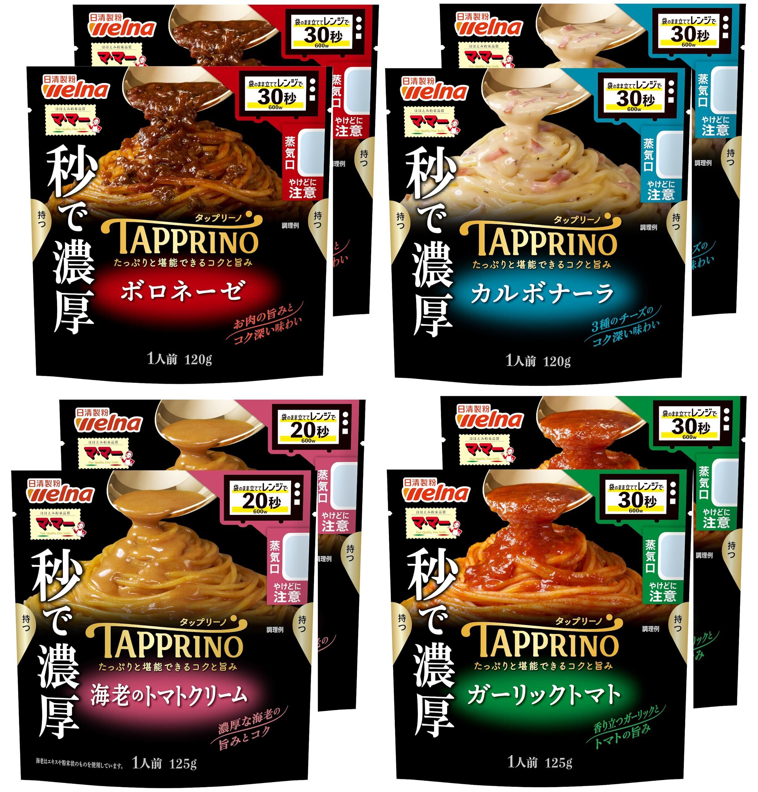 【Amazon.co.jp 限定】マ・マー 秒で濃厚レンチンパスタソース「TAPPRINO(タップリーノ)」食べ比べセット(ボロネーゼ、カルボナーラ、海老のトマトクリーム、ガーリックトマト)4種類各2個ずつ 【セット買い】