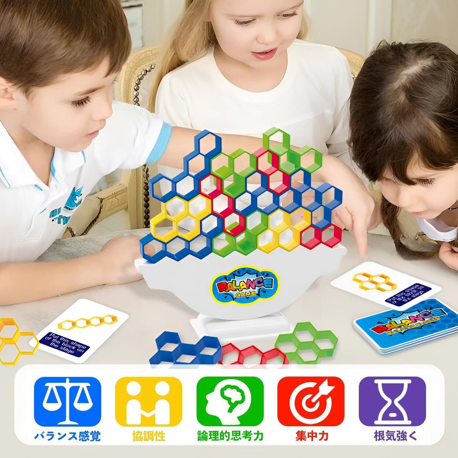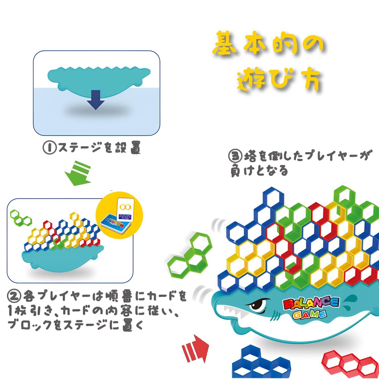 HMshuo 立体ブロック【日本語カード付 64個】バランスゲーム 知育玩具 (六角形)