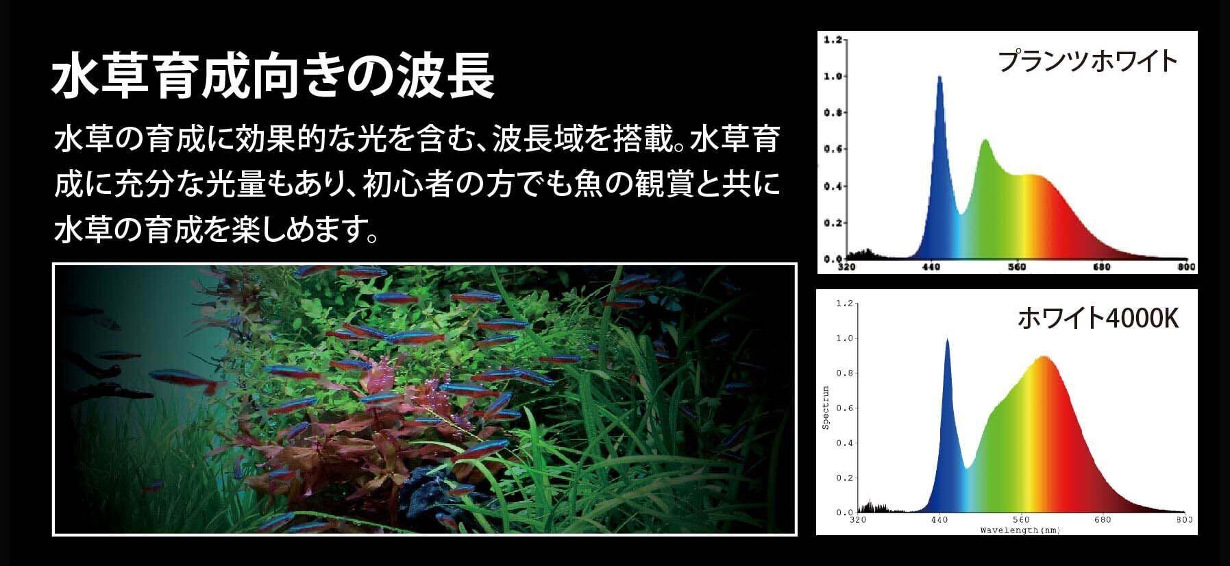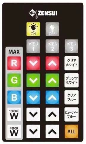 最大10万通の組み合わせ!ゼンスイ マルチカラーLED2 600 リモコン付き対象60~70cm水槽用淡水・海水両用特長●リモコンで操作し色を組み替えることができる高性能LEDライトです。●単色での使用や、色を組み合わせての使用も可能です。●RGB各色と2通りの白色光をそれぞれ10段階で調整することができ、最大10万通りの組み合わせにカスタムできます。●色で楽しむだけでなく、水草の育成も考えた光を搭載しています。●高い演色性のため、自然光が当たった時と同様の色を再現できます。●魚が綺麗に見える波長を搭載していて、自分の水槽にあった色にすることが可能です。●ガラス厚に関係なく、枠付き水槽、フレームレス水槽どちらにも設置可能です。●専用パーツ(別売り)を使用することで吊り下げ設置が可能になります。●吊り下げ設置時に追加パーツ(別売り)を使用すると二灯設置が可能になります。付属品本体×1個専用アダプター×1個専用リモコン×1個リフトアップ×2個リフトアッププラス×2個仕様LED素子推定半減寿命:50,000時間(使用環境により異なります)定格電圧:100V周波数:50Hz/60Hz共用消費電力:24W(全灯MAX点灯時)色温度(ケルビン):7,000K光束(ルーメン):MAX1,800lm(最高水準の明るさ)演色性:Ra94IP規格:IP66 IEC規格(国際電気標準会議)サイズ(約)幅600×奥行き68×高さ24mm(リフトアップ除く)コード長:約3.5m材質アルミニウム、ABS樹脂、PMMA樹脂生産国中国ご注意※本品は屋内観賞魚用の照明です。目的以外の用途では使用しないでください。お問い合わせについて商品の不明点につきましては、下記にお問い合わせください。株式会社ゼンスイ ユーザーサポートTEL:0480-33-2058(東日本地区)TEL:072-654-3743(西日本地区)