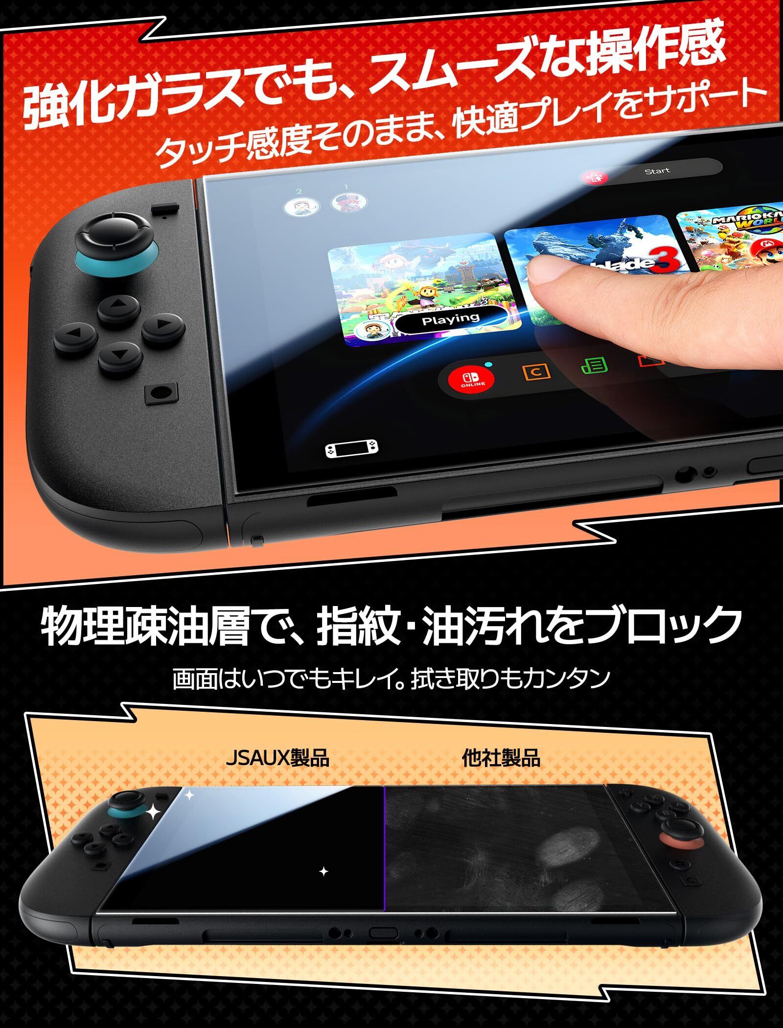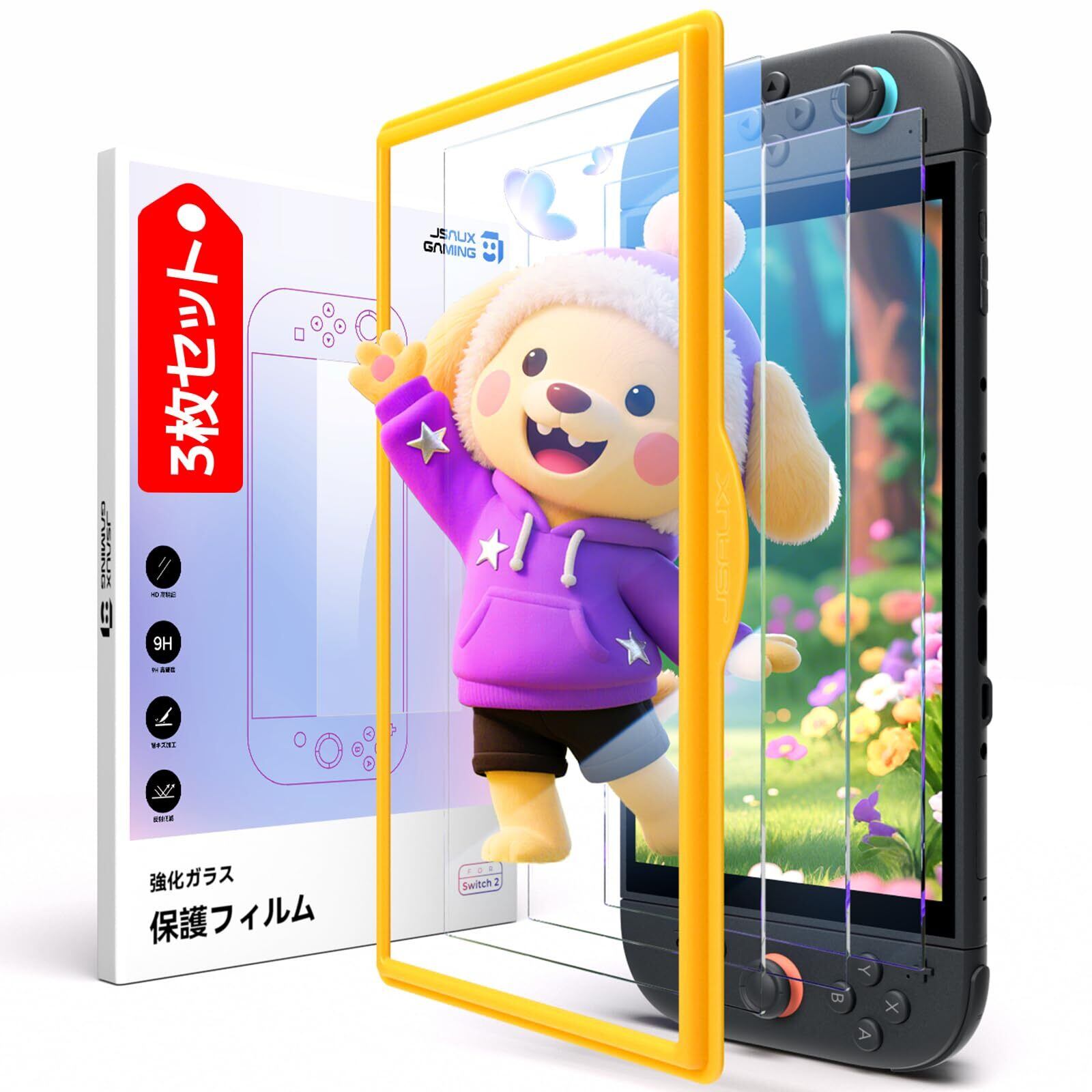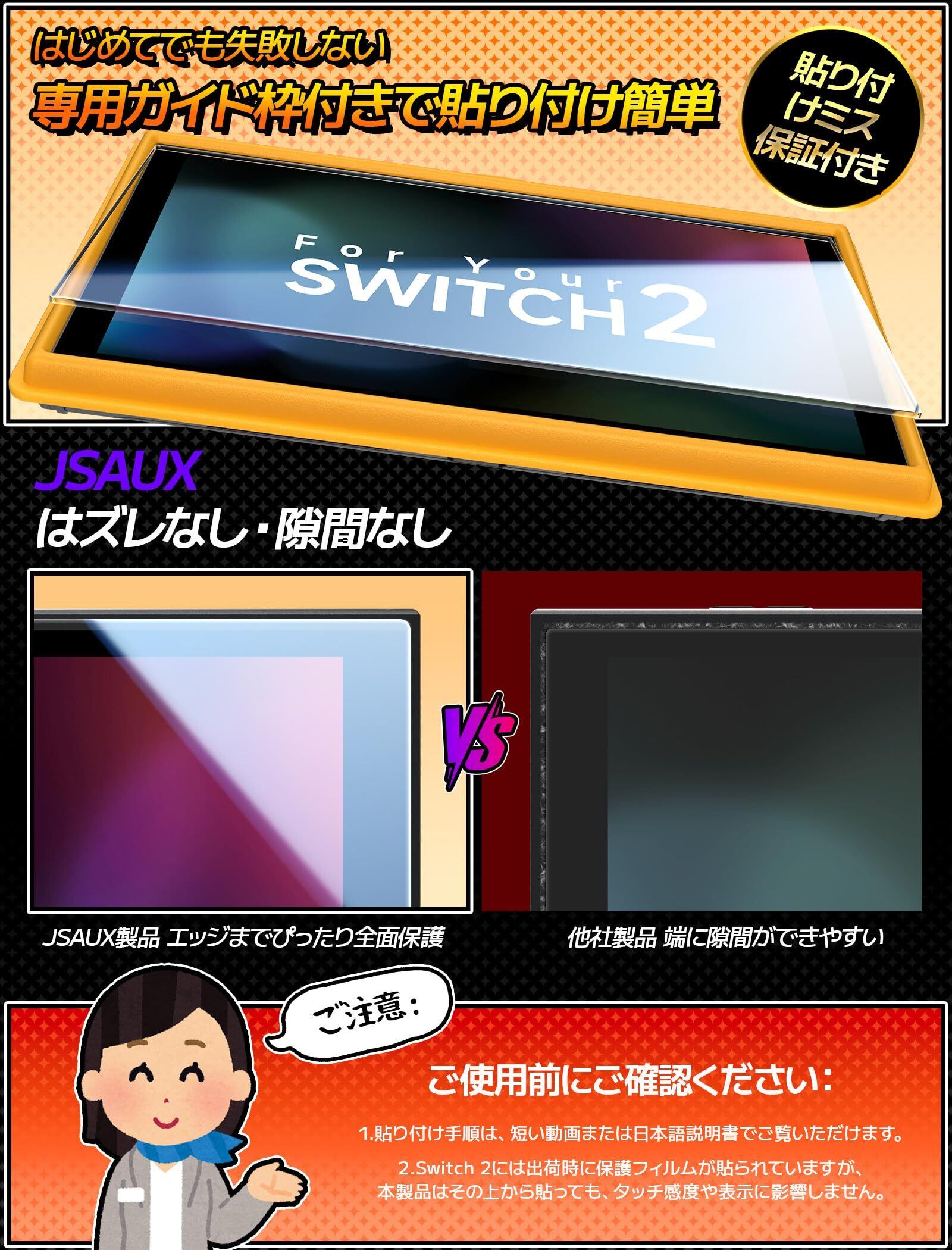 JSAUX 対応 Switch 2 / スイッチ2 保護フィルム 【3枚セット】簡単ガイド枠付き強化ガラスフィルム | 高透過率・全画面保護・超耐久9H硬度・気泡ゼロ・指紋防止・タッチ感度・超薄型・飛散防止・ドック対応