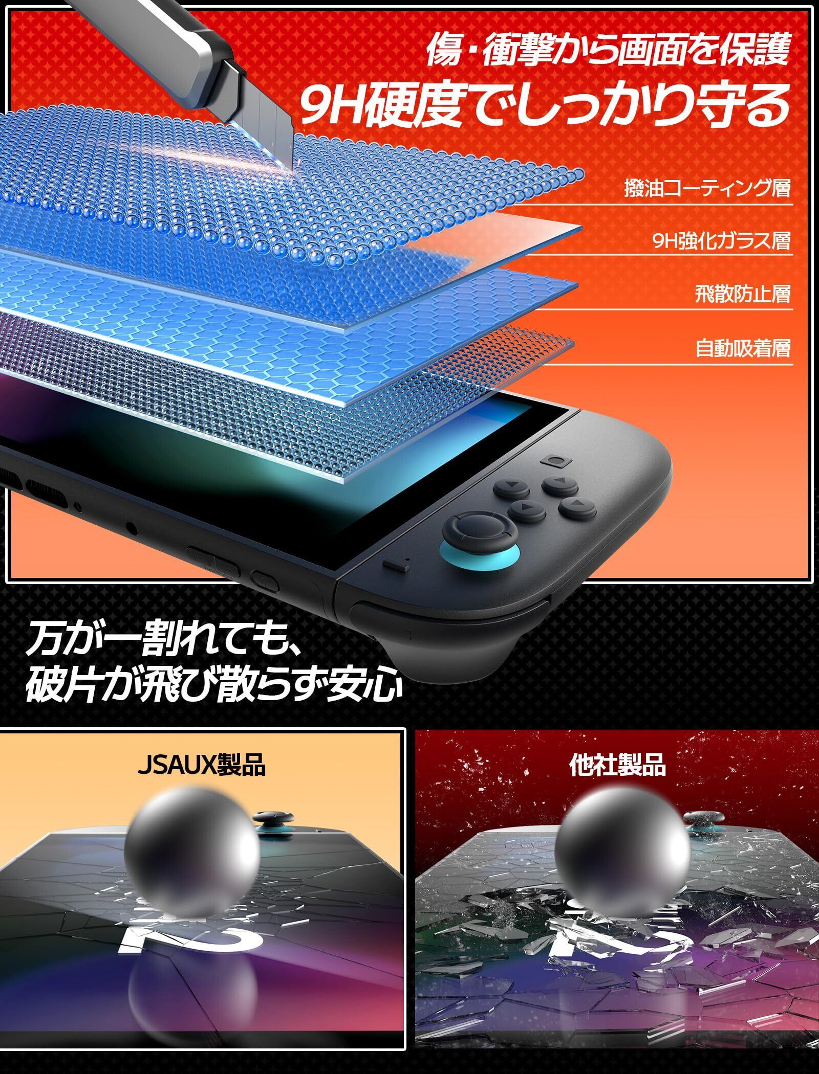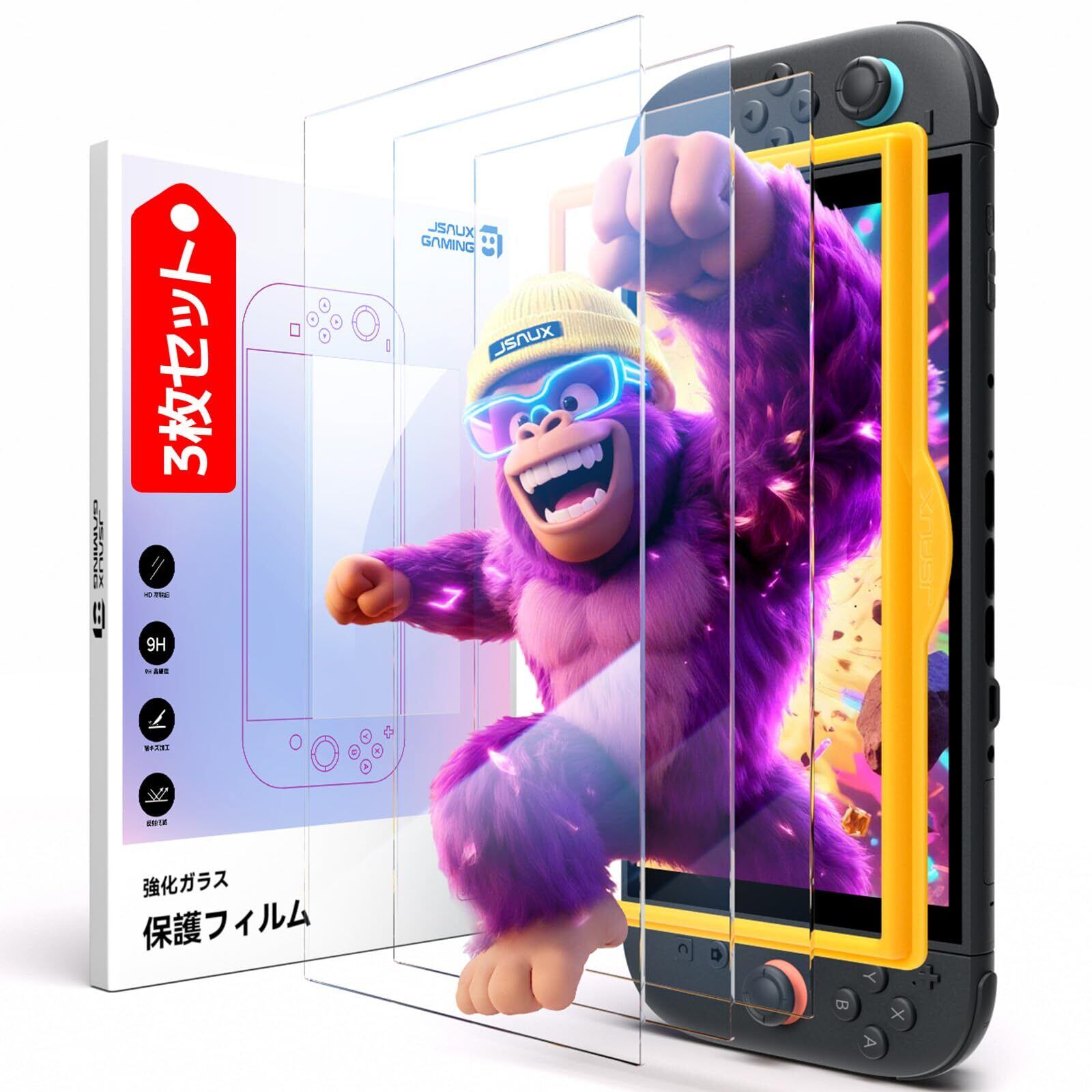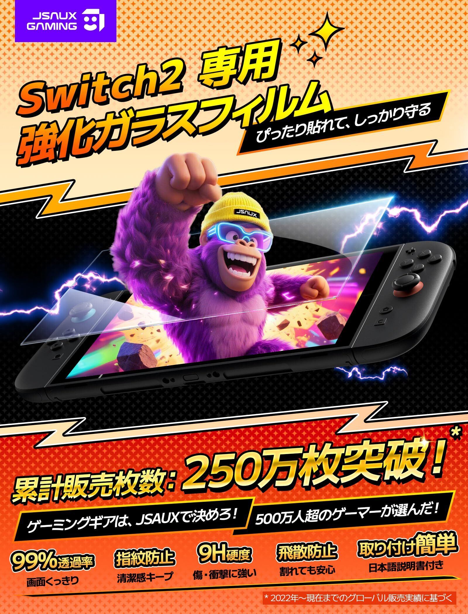 JSAUX 対応 Switch 2 / スイッチ2 保護フィルム 【3枚セット】簡単ガイド枠付き強化ガラスフィルム | 高透過率・全画面保護・超耐久9H硬度・気泡ゼロ・指紋防止・タッチ感度・超薄型・飛散防止・ドック対応