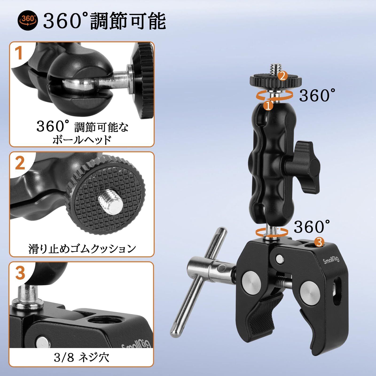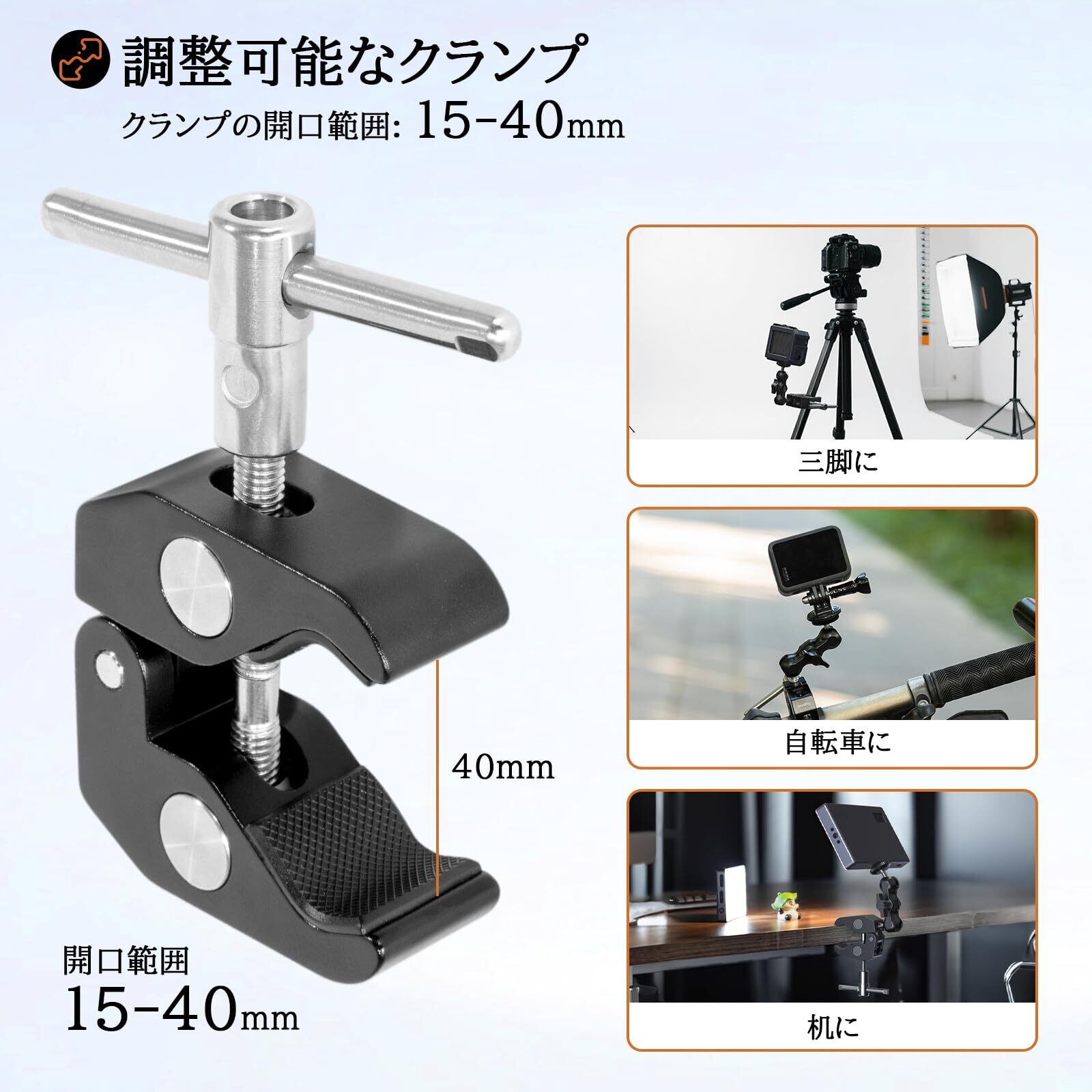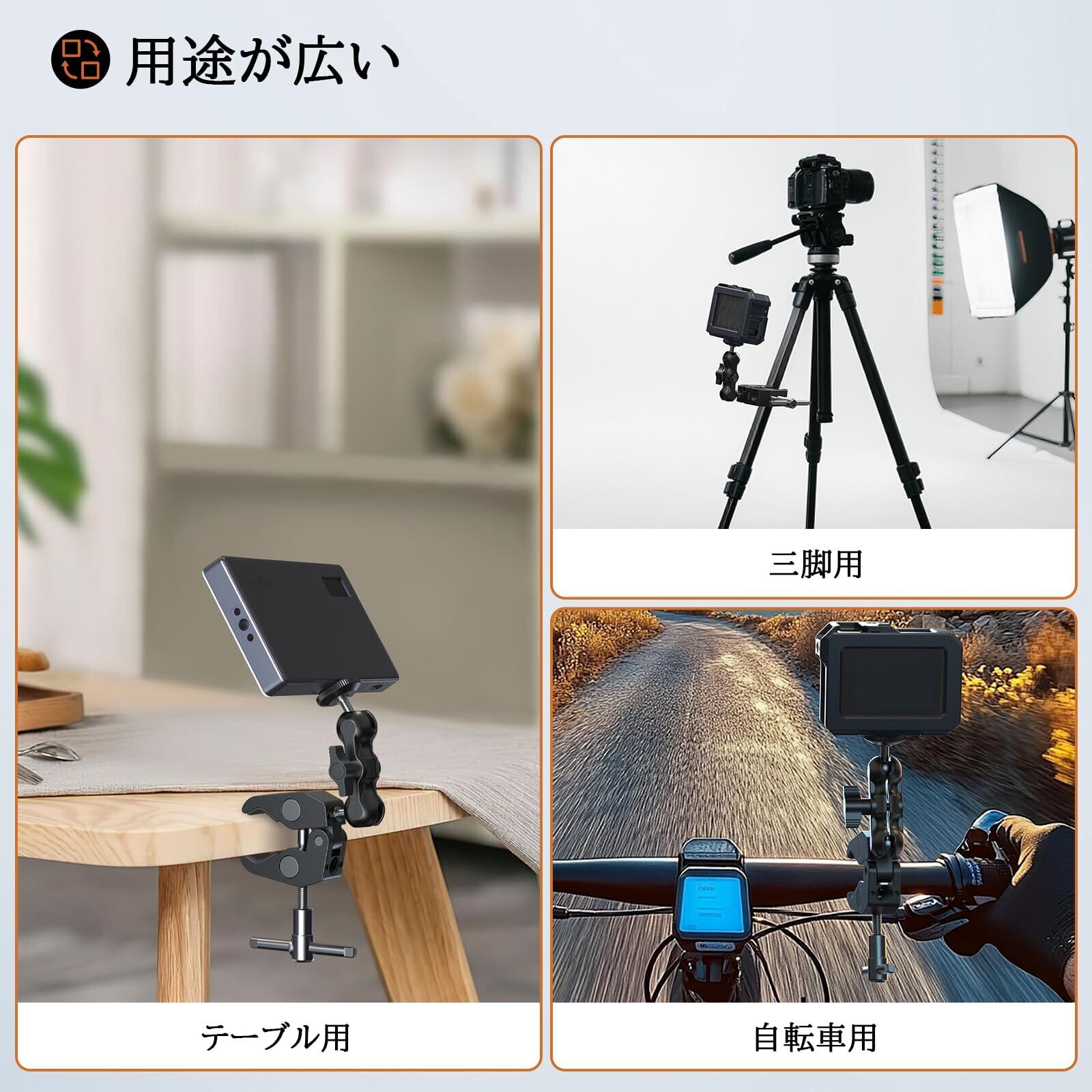 【360°調整可能】マジックアームのダブルボールヘッドは360°調整可能で、ノブを調整することでモニターの位置を自由に調整できます。ノブを締めるだけで、ダブルボールヘッドの両端の機材を固定しやすいです。最大荷重:1.5kg。マジックアームの長さ:89.5mm。