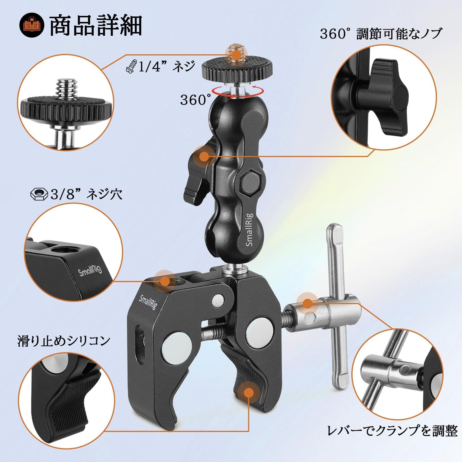 【優れた機能】中央のノブを締め付けるだけで、全ての間接部が同時に固定されます。そして、持ち心地の良いゴムを採用し、カメラリグの脱落や破損を防ぎます。
