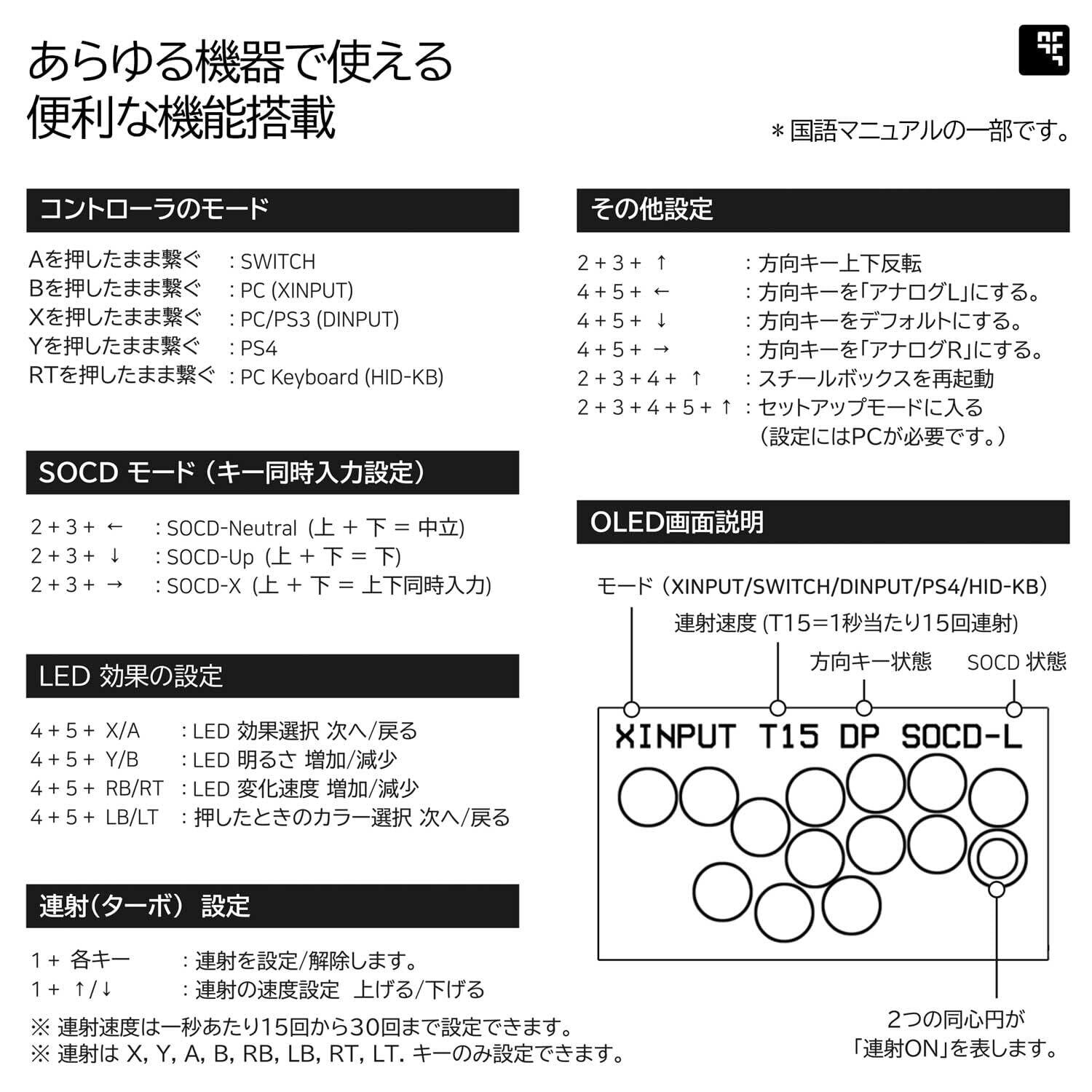 CPT基準でもオッケー、音ゲーにも無理なく使えるレイアウトになります。 PCのブラウザーから設定画面に接続することで、ボタンはどれにでも設定することが可能です。 ボタン組み合わにより、簡単にSOCD設定を切り換えることができますので、SOCD-Xにしてキーボードモードに接続させると、 音ゲーでも抜群に使えるようになります。 ※出荷時設定はSOCD-Nと設定されています。SOCD切り換えのボタン組み合わせは 国語マニュアルをご参照ください。