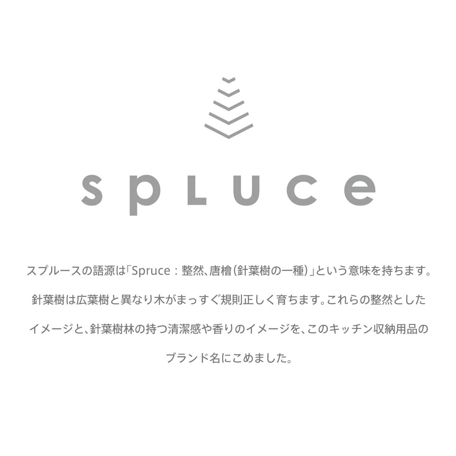 コンセプト:スプルースの語源は Spruce:整然、唐檜(針葉樹の一種)という意味 を持ちます。針葉樹は広葉樹と異なり木がまっすぐ規則正しく育ちま す。これらの整然としたイメージと、針葉樹森の持つ清潔感や香りの イメージを、このキッチン収納用品のブランド名にこめました。