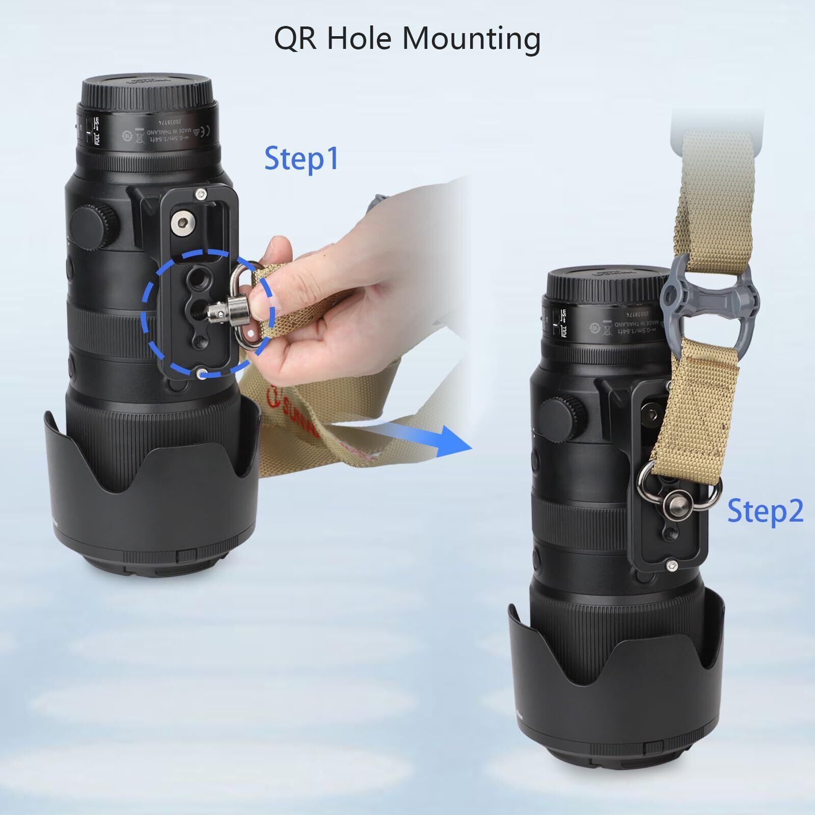 取り付け方法: 1. レンズからファクトリーフットを取り外します 2. Leftfoto レンズフット交換部品を1/4-20ネジを使用してレンズに取り付けます 3. 接続が確実になるまでネジを締めますただし、締めすぎないでください 4. 安全停止ネジを2本取り付けます (安全停止ネジは不要です)