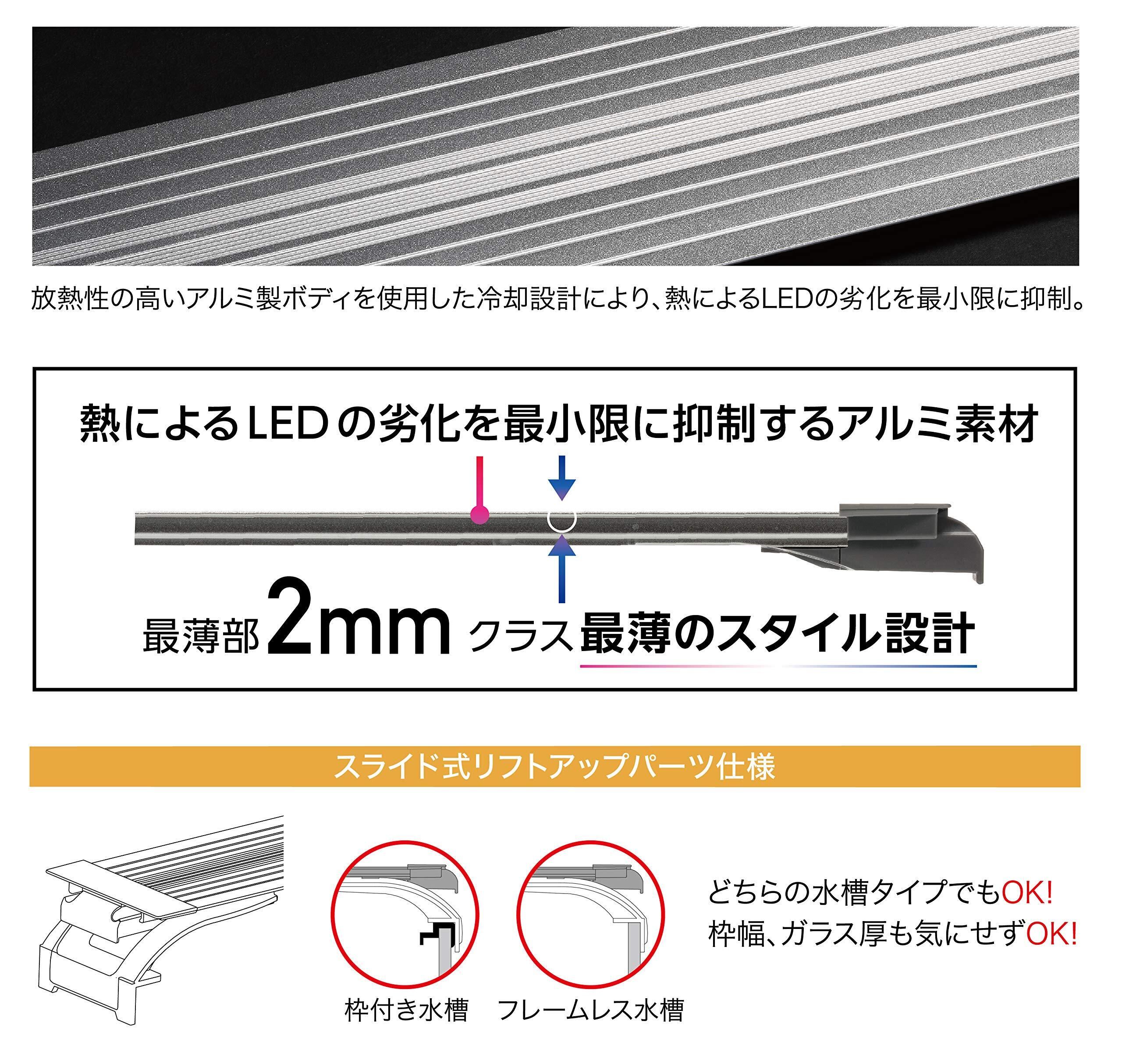 使えば分かる究極の薄さ、明るさ、美しさ。目指したのはハイクオリティスタンダード。放熱性の高いアルミボディを使用した冷却設計により、熱によるLEDの劣化を最小限に抑制。20~32㎝以下水槽用 全光束190lm 定格入力電力AC100V 50/60Hz 定格消費電力 4W ボディカラー:シルバータイプ