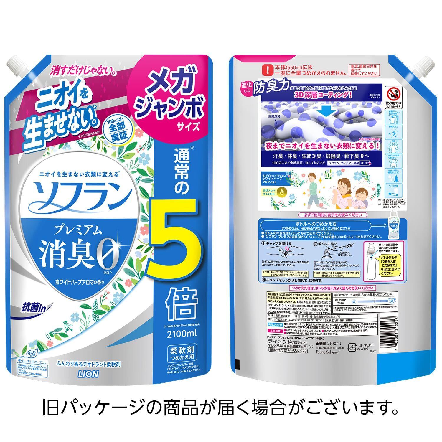 ソフラン プレミアム消臭 詰替メガジャンボ2100ml ホワイトハーブアロマ 生乾きでも菌を生ませずニオわせない 柔軟剤 抗菌 部屋干し 汗臭 体臭 加齢臭 靴下臭